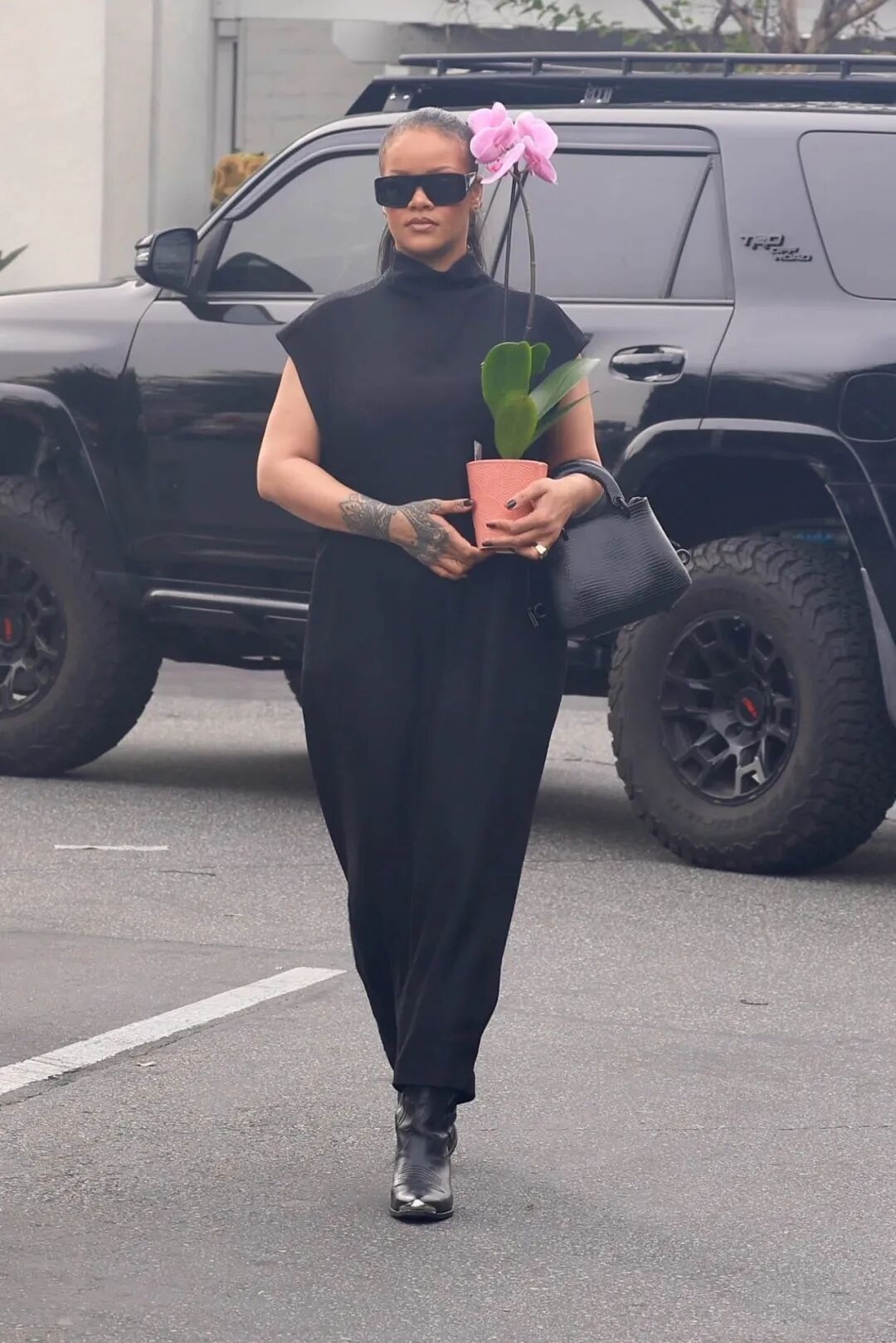 当天穿着一件露脐白色T恤,露出小腹,搭配宽松的卡其色长裤和红色腰带。 披上一件棕色外套,脚踩黑白相间的高跟鞋,手里拎着一个LV手提包。