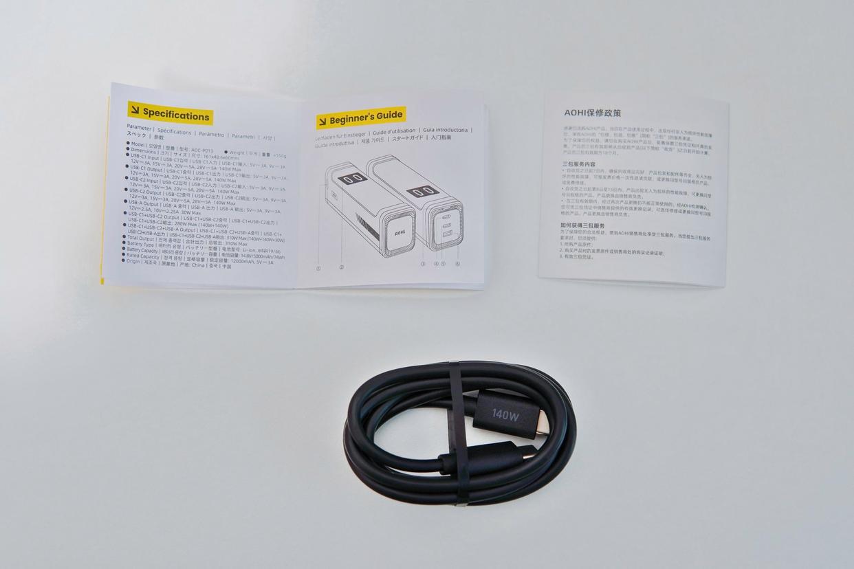 ▲打开包装,除了产品本体,配件就很简单了,一份多语言说明书,一份保修政策说明和一根140W C to C数据线(长1米)。