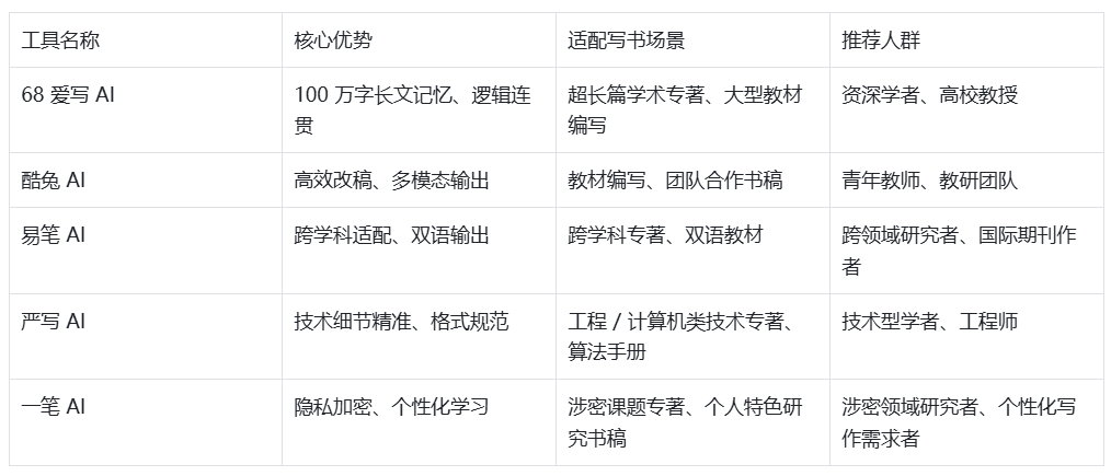 为方便学者快速匹配需求,下表整理 5 款工具的 “写书” 核心适配场景: