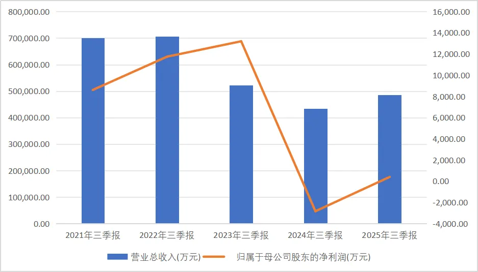2025年前三季度营收48.65亿元,同比增长12.15%,归母净利润仅404.65万元,扣非净利润持续为负。