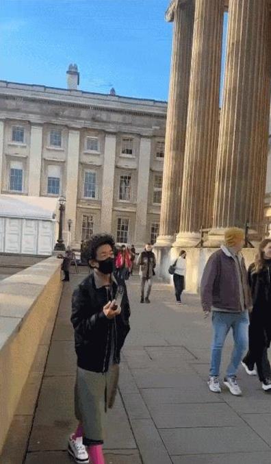 冯清在伦敦街头微微弯腰,凑近王宝强的手机屏幕,两人相视一笑。