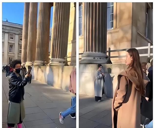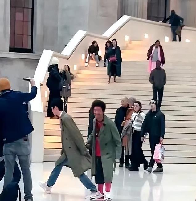 人群熙攘,一位头戴标志性爆炸头的男子,正兴奋地举着手机,镜头对准一位高挑优雅的女子。