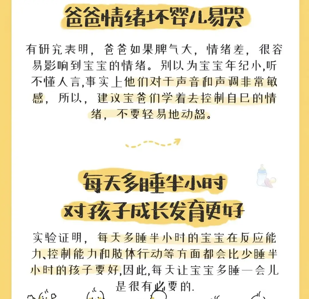 1. 爸爸情绪很重要:爸爸的情绪对宝宝影响很大。宝宝虽小,但对声音和声调很敏感,爸爸脾气大、情绪差,容易影响到宝宝的情绪,所以宝爸要学着控制情绪,保持平和的心态。