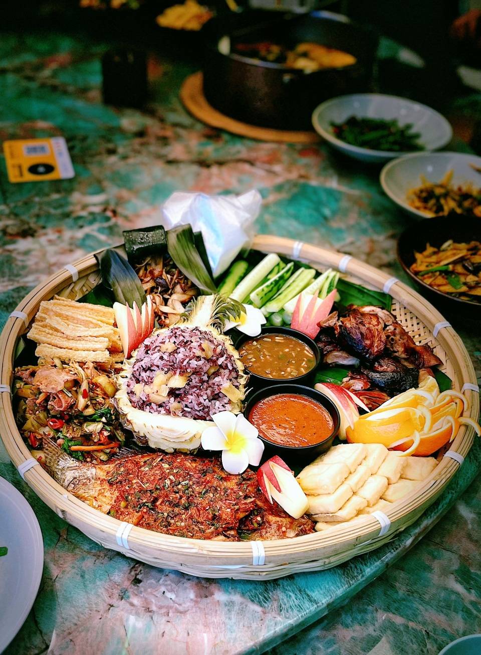 竹编的簸箕中间是糯唧唧的菠萝饭,旁边还有烤鱼,小刀鸭,建水豆腐,辣炒牛肉,炸猪皮和芭蕉叶包烧的菌菇,另外还有一些蔬菜和水果点缀其中。