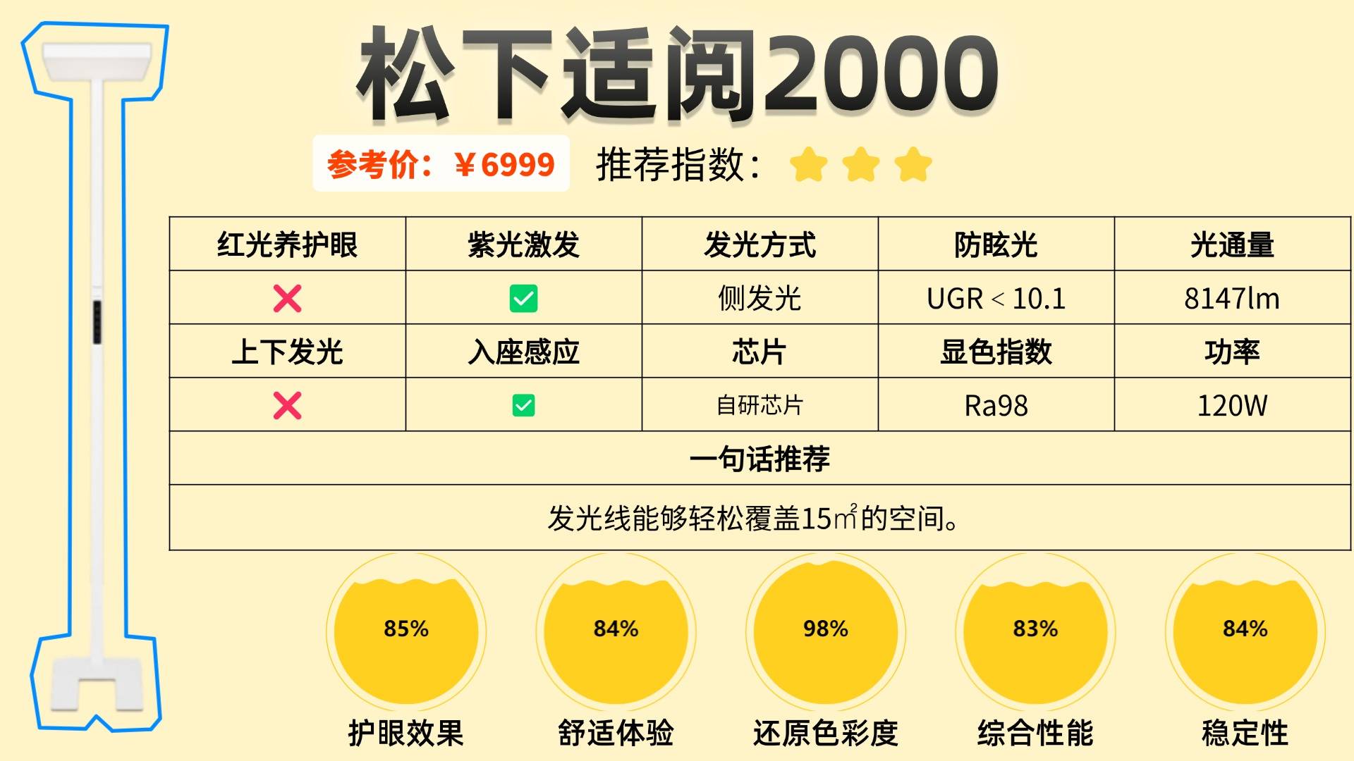 护眼大路灯排行榜第六名:松下适阅2000;显色指数维持在Ra98左右,色彩还原表现可靠。