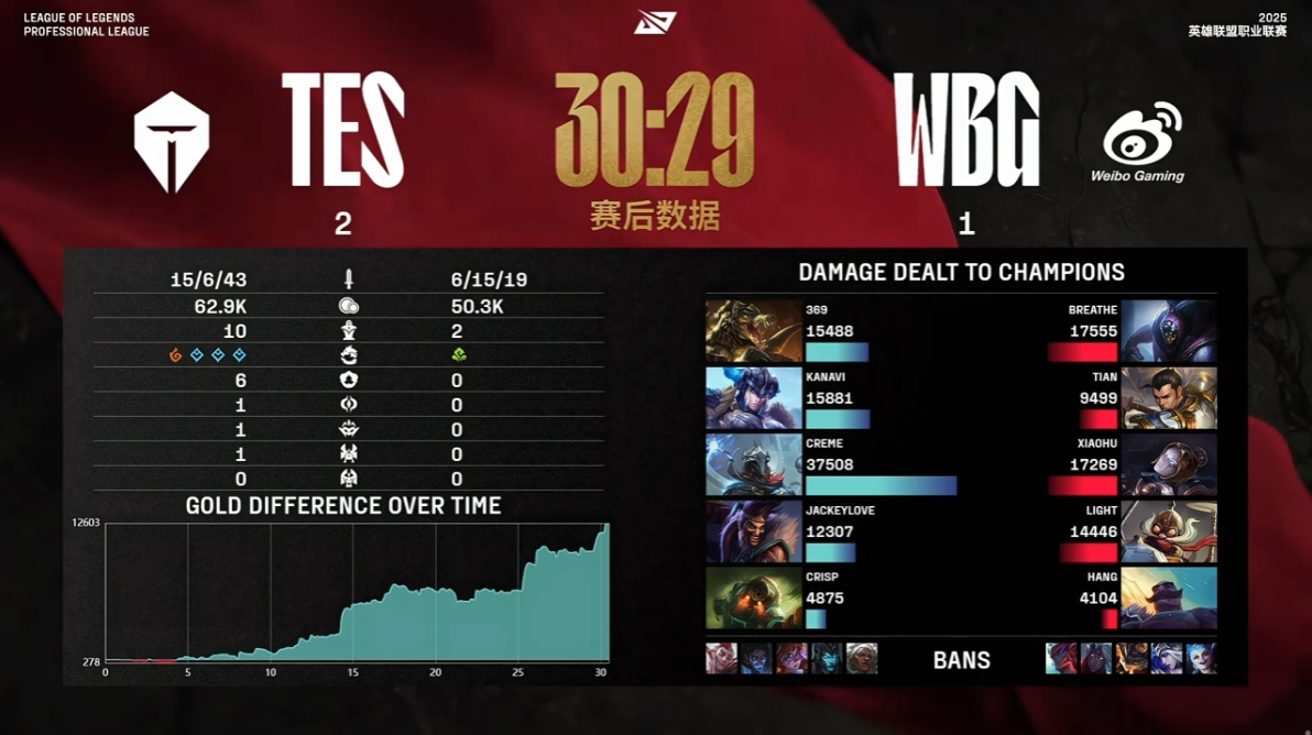 WBG虽然赛前就不被看好,但还是在第二局中拿下了胜利,进入第三局的情况下TES直接拿出了德莱文。近几年TES在世界赛上,德莱文拿出来面对强敌时可没打出什么好效果。然而这是在国内的LPL联赛,往往对手从对线期开始就已经被Jackeylove的德莱文碾压了。更何况这局14分钟喜提双杀,最后对位更是达到了三四千的经济差。