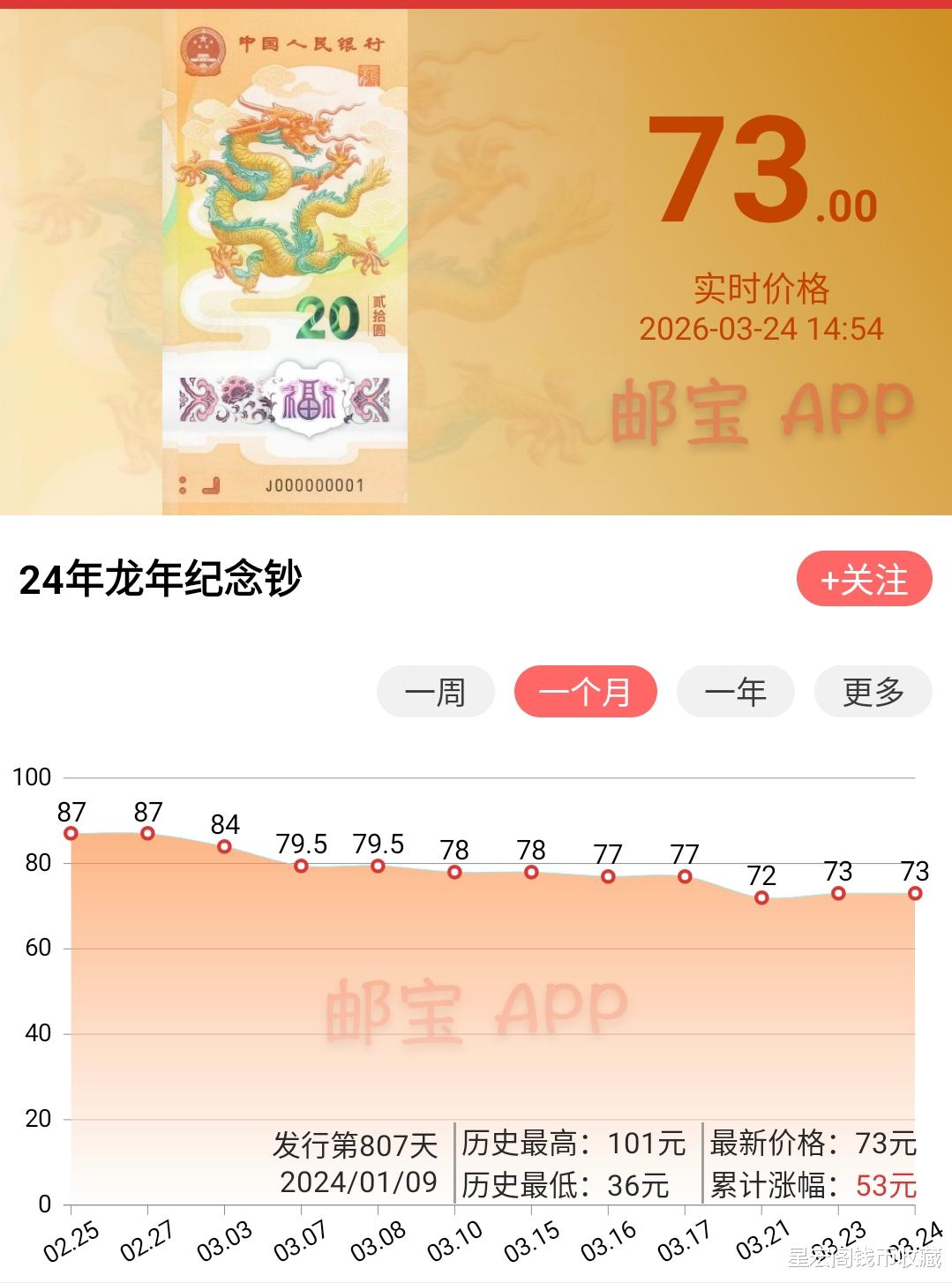 2024年龙年纪念钞市场行情也跌破了80元大关,按照现在的市场行情来看2024年龙年纪念钞散钞通货的价格也已经来到了70~73元左右。2024年龙年纪念钞跌破70也只是一步之遥,按照现在整个市场上生肖纪念钞的热度来看,很有可能2024年龙年纪念钞散钞通货的价格跌破70元大关。