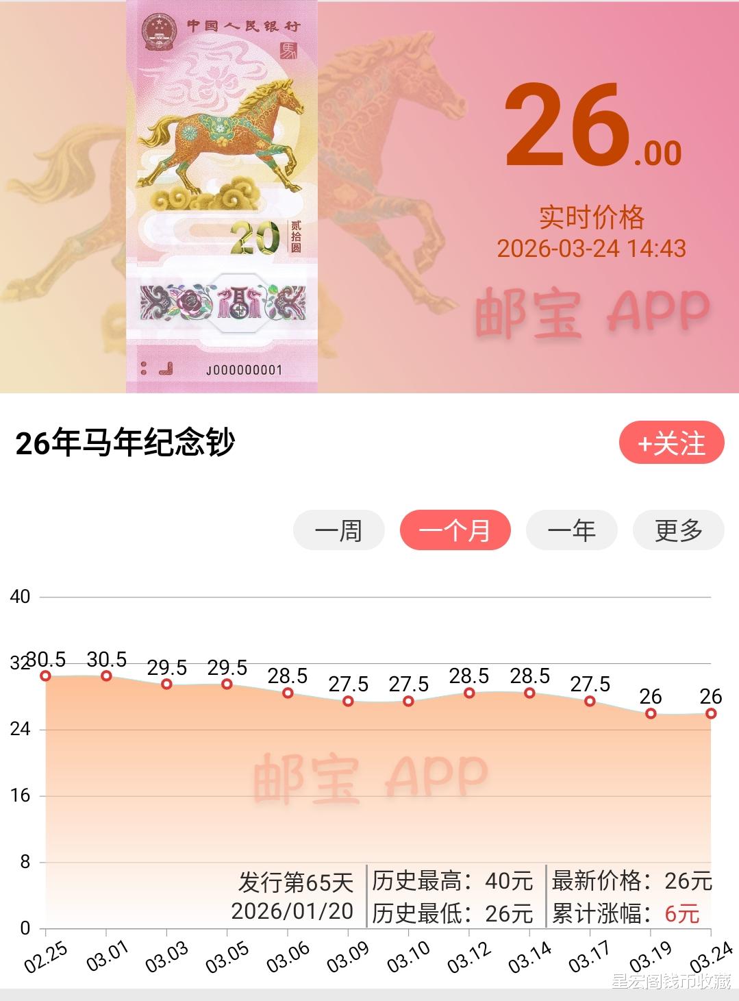 2026年马年纪念钞在春节假期的时候,基本上能稳定在30元左右的市场行情,但是春节假期结束以后,市场行情也一路下跌,从30.5元左右的市场行情一直下跌到现在26元左右,现阶段最低求购报价也已经来到25.5元左右。