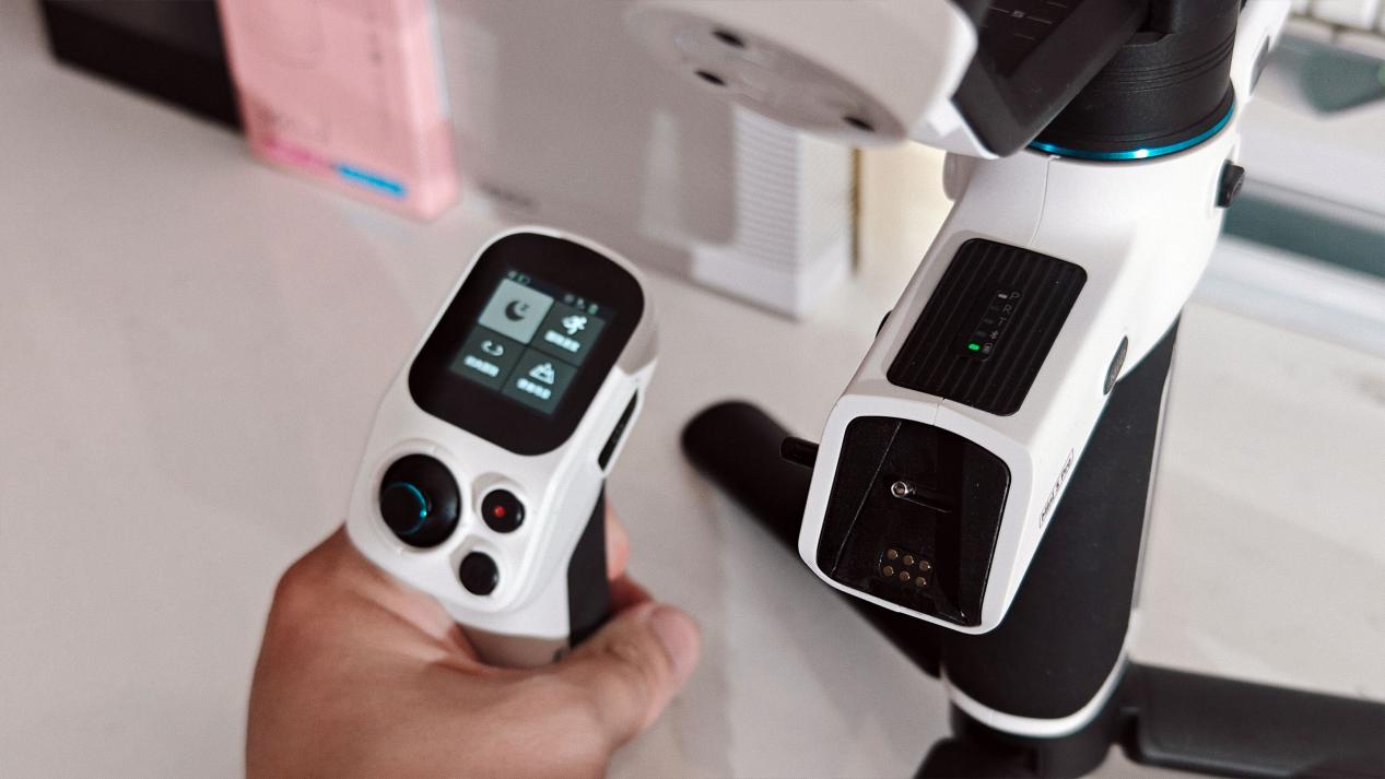 飞宇SCORP MINI 3 Pro这次另一个大的调整是在手柄方面,这次是做了可拆卸手柄,不仅支持触点式的连接,同时也支持无线连接,脱离稳定器也能进行对稳定器进行操作,这个设计我觉得就有很大的发挥空间,通过一些配件进行更好的搭配,同时在这个接口上设计手机支架用来做监视器也能发挥非常不错的用途,或者更加精确的拍摄内容。
