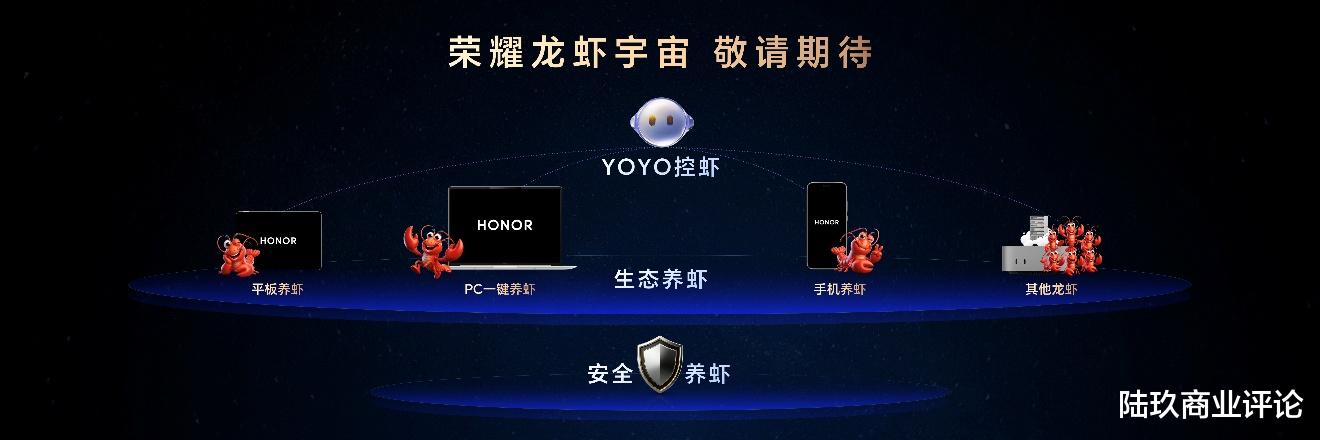 发布会上,还公布了生态级的荣耀龙虾宇宙,支持PC一键养虾、平板养虾,未来还能兼容其他生态设备的龙虾接入。用户可以通过YOYO在荣耀手机上直接和小龙虾交互,并安全地开放手机智能体供小龙虾调用,实现生态养虾、安全养虾和YOYO控虾三大能力。这些功能将于近期陆续开放内测。