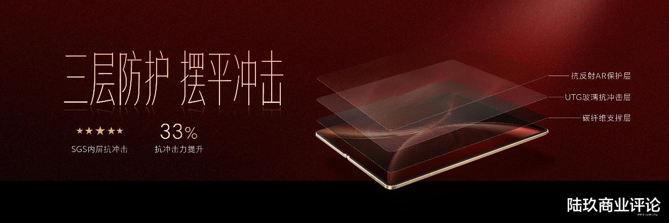 内屏同样有至臻黑钻屏旗舰素质。全新升级超韧UTG玻璃,折痕相比上一代产品改善44%,通过了SGS无感知折痕认证,呈现出仿佛没折的平滑效果。同时,通过碳纤维支撑层、UTG玻璃抗冲击层、抗反AR保护层等三层防护,抗冲击力提升33%,由内到外,可靠属性拉满。
