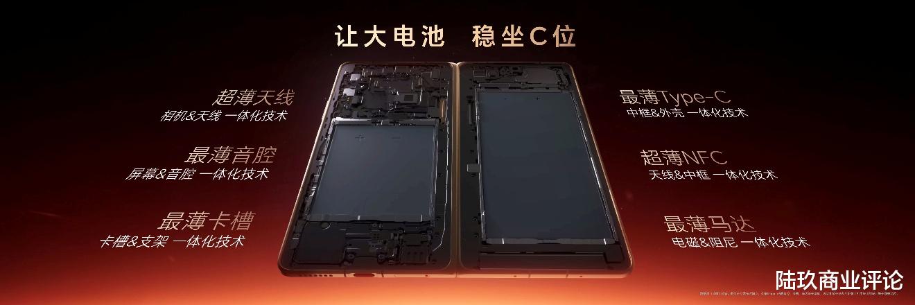 在内部设计方面,为了在极限空间里给电池留下足够空间, 荣耀Magic V6针对内部空间做了系统性考量,对天线、音腔、卡槽、Type-C、NFC、马达等组件进行极致轻薄化处理,让电池稳坐C位。