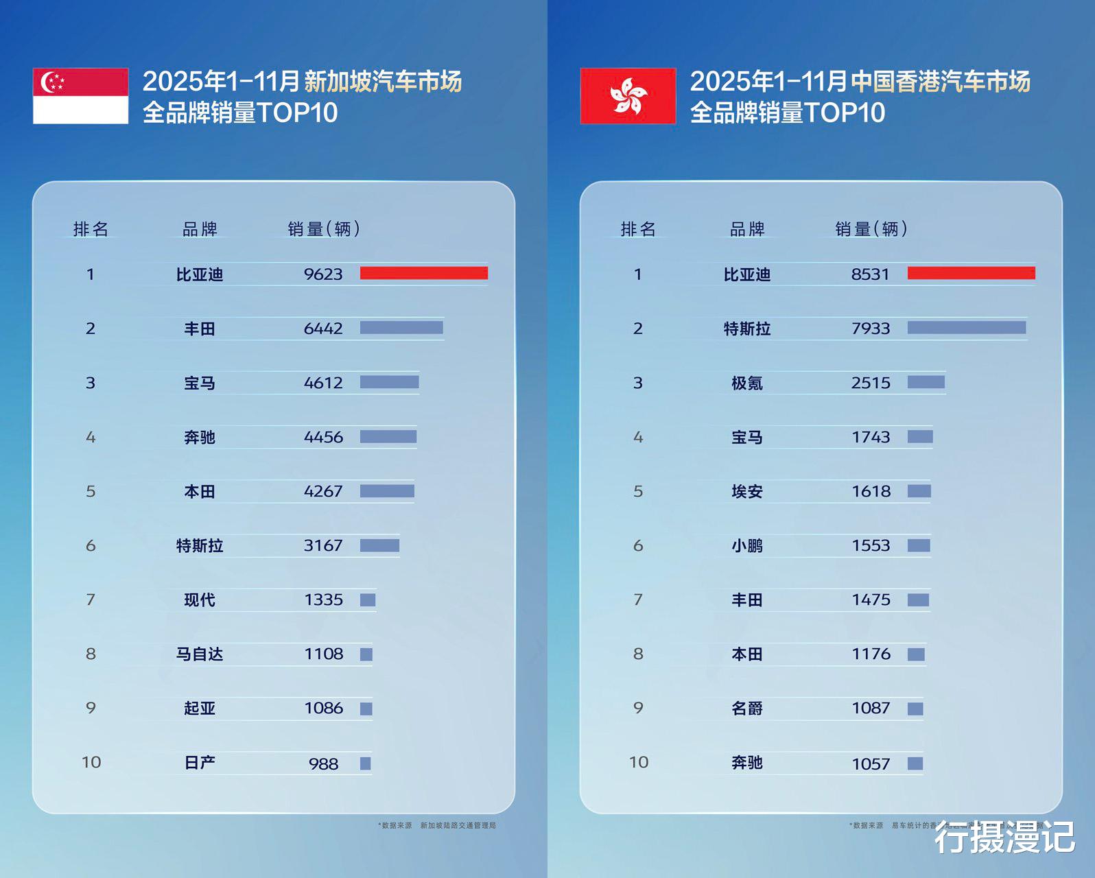2025年1月至11月期间,在英国、德国、意大利、西班牙、奥地利、爱尔兰、马来西亚、土耳其、新加坡、泰国以及中国等11个汽车核心国家市场中,比亚迪的销量已全面超越特斯拉。