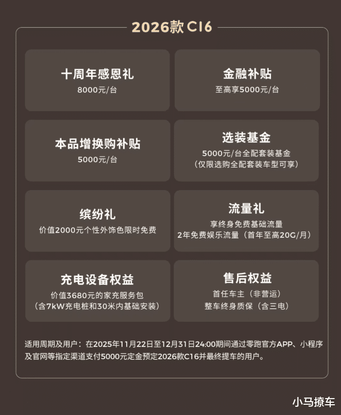 为什么单独把零跑C16单独拎出来说,小马看来有这几个原因,第一就是零跑今年是真的太火了,而且已完成50万辆全年销售目标,消费者都是冲着谁家好去买谁,所品牌和产品质量一定有保证,不会随意就暴雷了。第二就是12月买C16可直减8000元,更免费送家充设备和整车终身质保,如果再加上年底最后一波新能源补贴政策,综合算下来14万就能买到一台六座SUV,便宜,真是太便宜了。