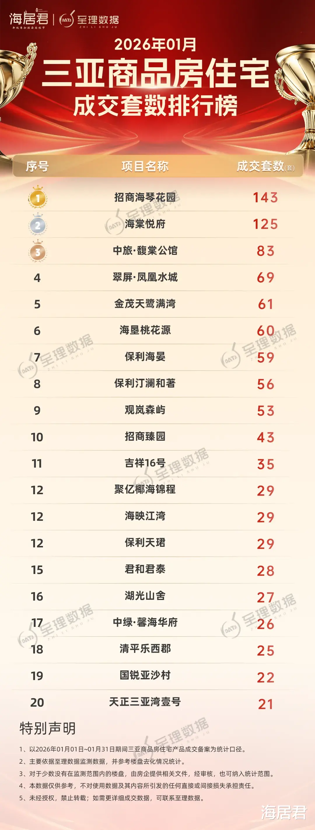国锐亚沙村热销22套,项目对外称1月强势揽金4.3亿元;三亚湾新城天正三亚湾壹号实景兑现受捧,成交21套,位列当月热销榜行列。