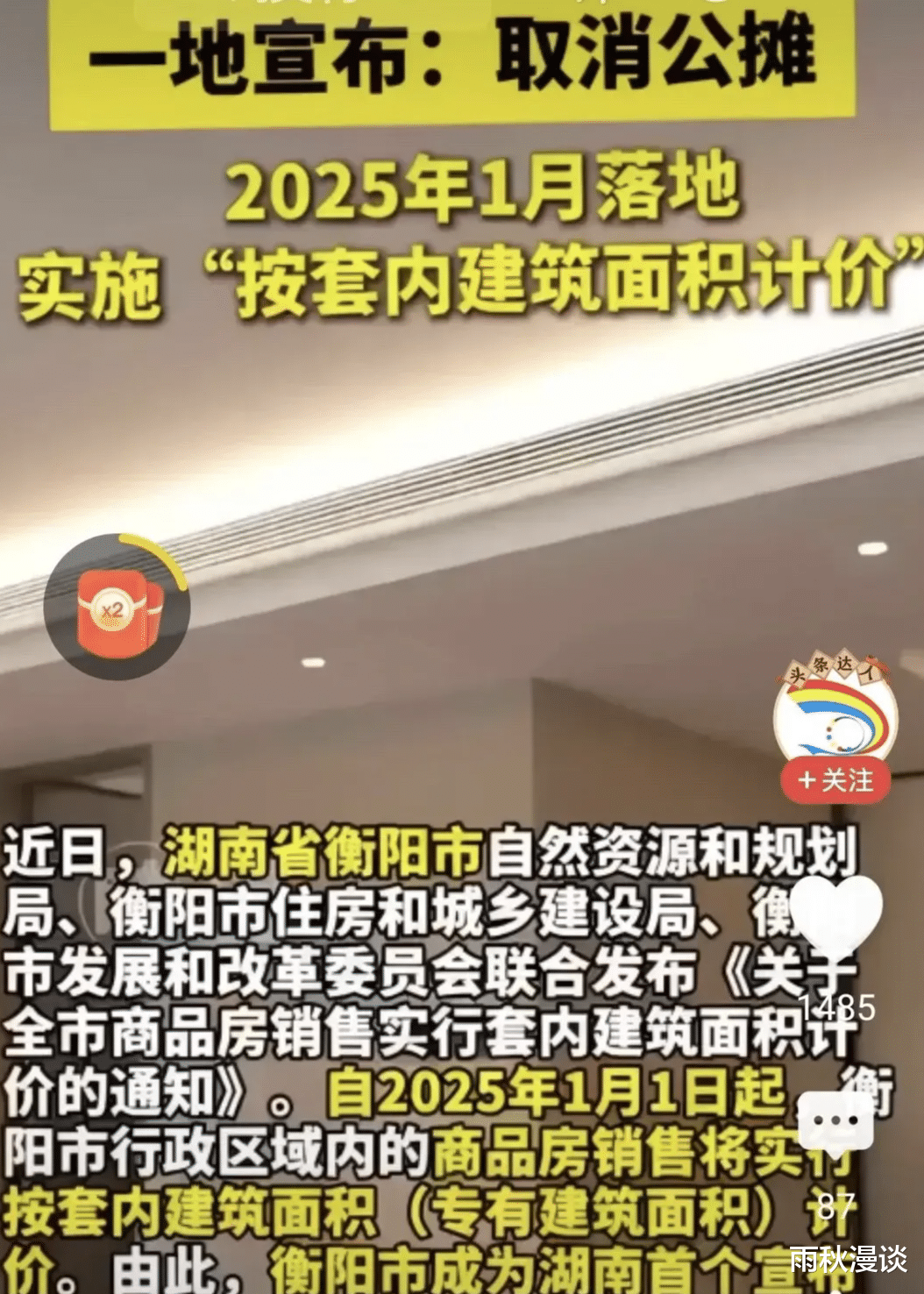 湖南衡阳市官宣从明年1月1日起取消公摊面积,购买即所得。这意味着购房成本降低以及未来的房屋使用成本降低,物业费等各种费用均降低,未来甚至不排除,开发商会在“零公摊”的基础上再送面积,以此来激发购房者的热情。