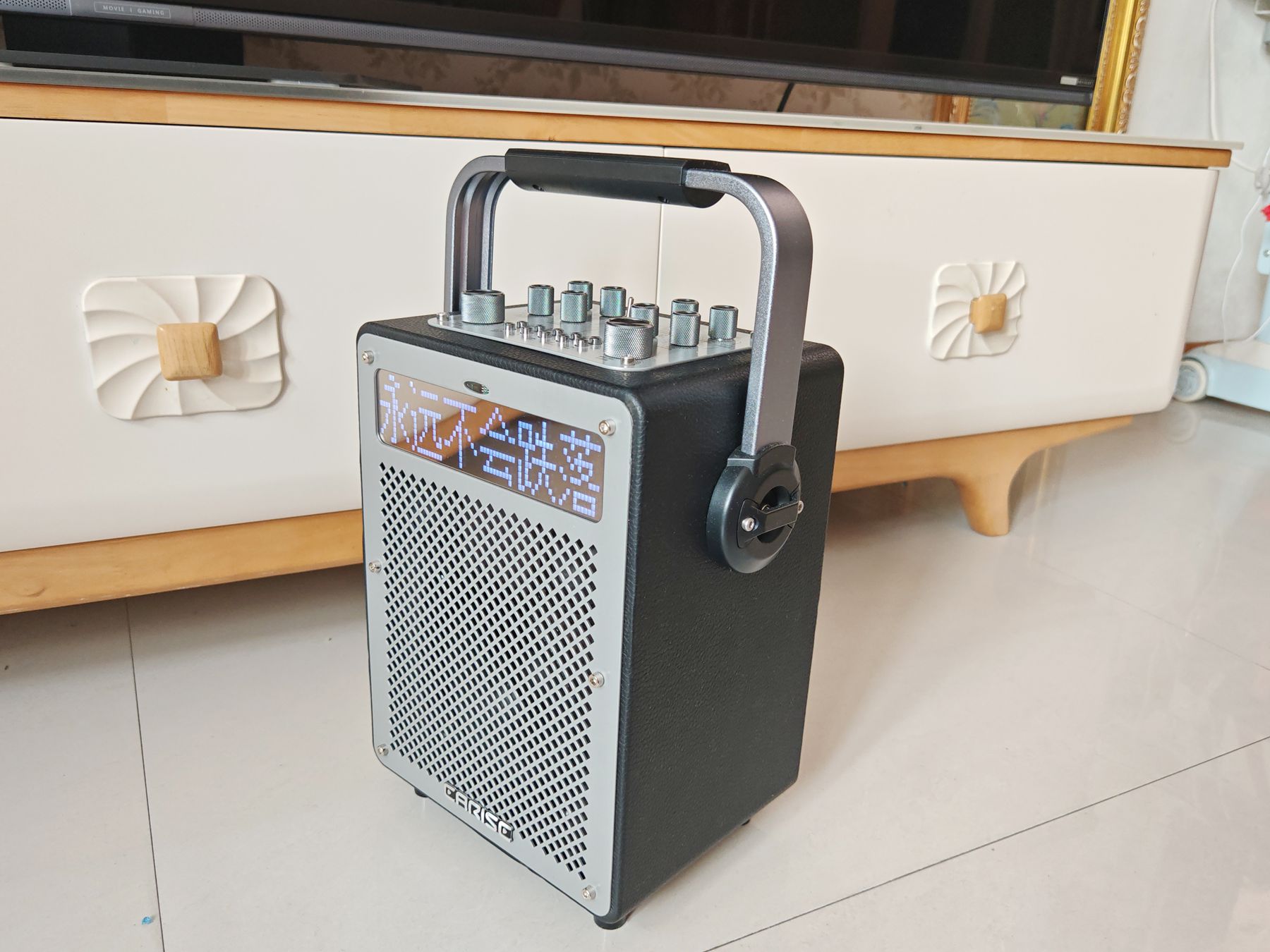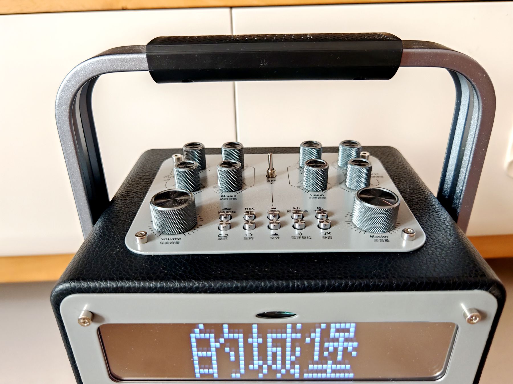 刚收到这款音箱就被它的外观吸引了,雅兰仕K88的外包装采用简约大气的黑灰配色,搭配流线型科技纹路,摒弃了传统户外音箱的廉价感,摆在桌面更像一件专业影音装备。金属质感机身触感细腻扎实,中间嵌入高清提词屏,顶部一体成型的铝合金提手设计尤为亮眼,边角经过人体工学倒角处理,握感丝滑贴合手掌,细节处尽显用心。