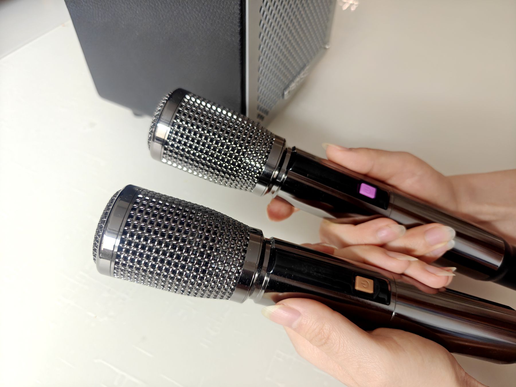 配件方面堪称完美,两支U段金属麦克风、实用遥控器、Type-C充电线,无需额外购置配件。值得一提的是,随机附赠的麦克风采用锌合金材质,拿在手里沉甸甸的,握感舒适且档次感十足。