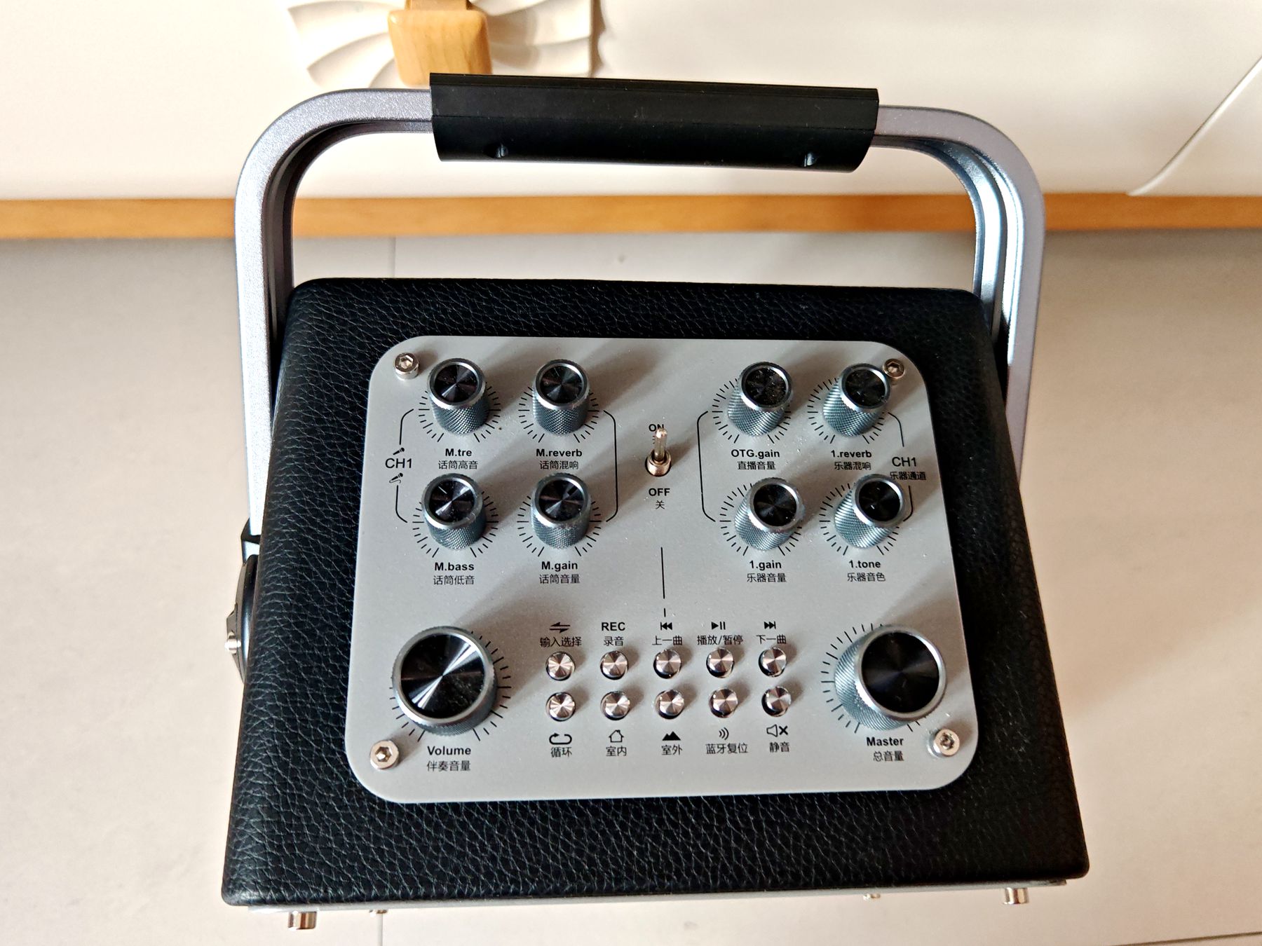 音效调校方面,K88展现出远超同价位产品的专业性。机身内置高性能山景音频方案,搭配专业级DSP数字处理芯片,还集成了独立声卡功能,顶部面板的多旋钮+多功能按键布局清晰直观,即使是新手也能快速上手。总音量、伴奏音量、麦克风音量、高音、低音、混响深度等参数均可单独调节,更贴心区分了“室内”与“室外”两种声场模式。