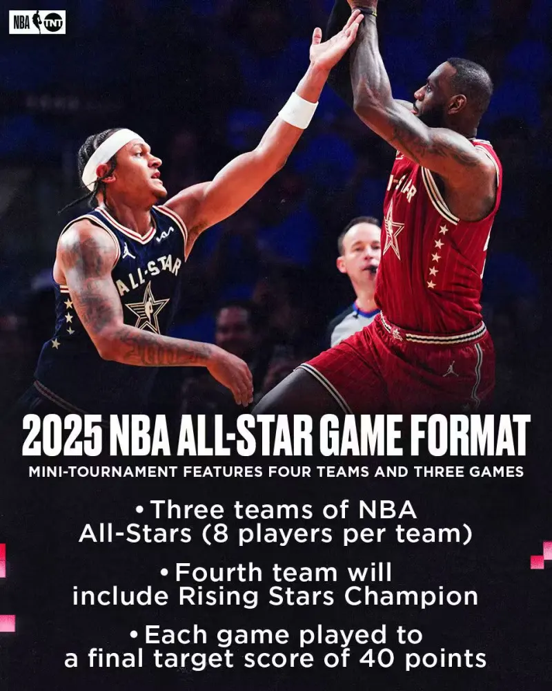 此前,NBA官方宣布了2025年全明星赛的新赛制:将首次以四支球队和三场比赛的小型锦标赛形式进行。第一场和第二场获胜的队伍将在冠军赛中相遇(第三场)。每场比赛中,第一个得分达到或超过40分的队伍将成为获胜者。4支球队中有3支是从24个全明星里面选队,另一支则是新秀挑战赛的冠军。联盟希望通过这一改革,告别东西部对抗,引入四队淘汰赛,并通过目标得分制(半决赛40分、决赛50分)提升比赛强度,再拉上新秀队制造“下克上”的悬念。