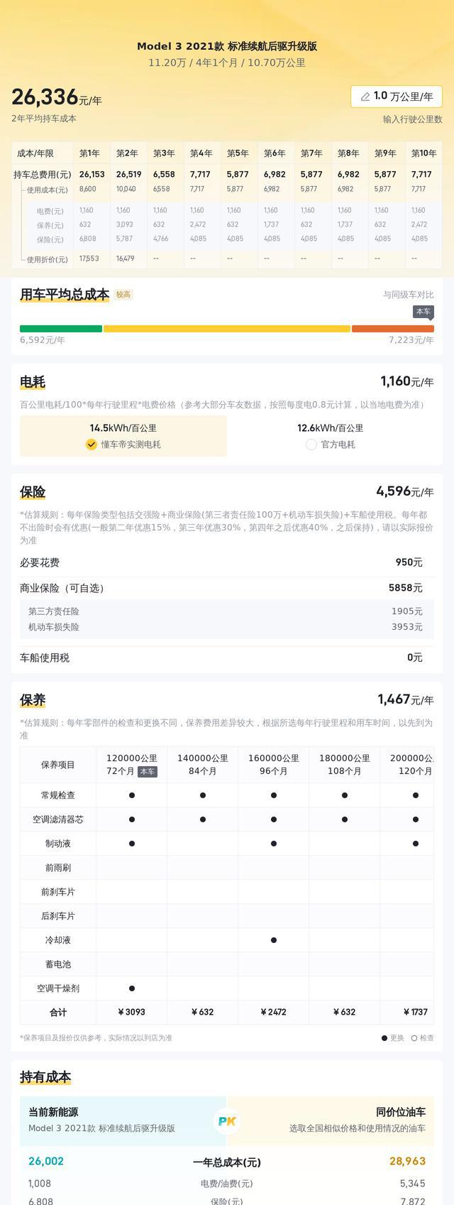 对于购车者来说,选择购买二手Model 3的最大吸引力,不仅是因为价格从新车的26.77万降低到了11.2万的诱人折扣,更因为电动汽车的使用成本相对较低。根据市场预估,这款车的年均用车成本大约在6706元左右,处于同级车的中等水平。相较于传统燃油车,电动车的能耗成本较低,更加环保,且减少了对常规油价波动的依赖,足以让许多消费者心动。