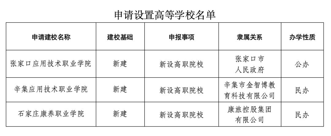 根据《中华人民共和国高等教育法》《高等职业学校设置标准(暂行)》等有关规定,经河北省高等学校设置评议委员会专家考察和评议,新设张家口应用技术职业学院、辛集应用技术职业学院、石家庄康养职业学院事项获得通过,现将学校名单向社会公示。