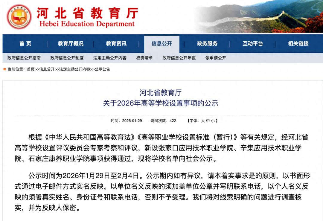 1月29日,河北省教育厅网站发布关于2026年高等学校设置事项的公示。