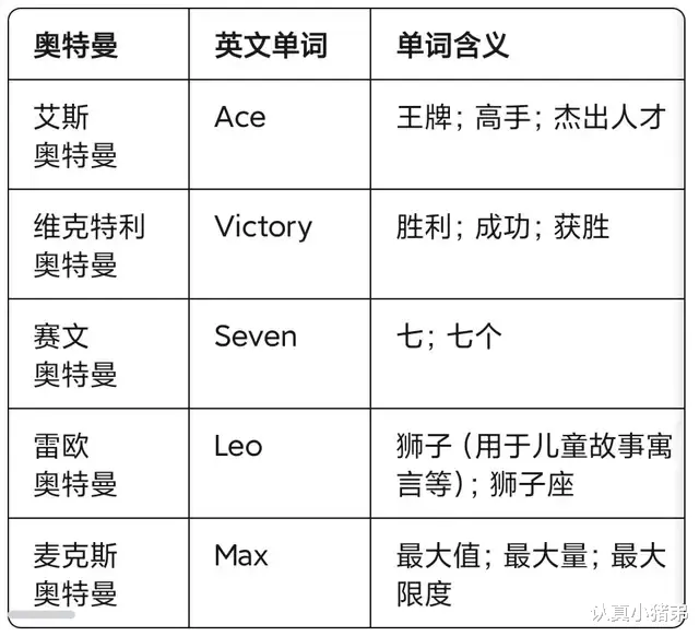 不仅如此,很多我们耳熟能详的奥特曼,他的名字其实也是英文音译,我给大家整理了一个表格。