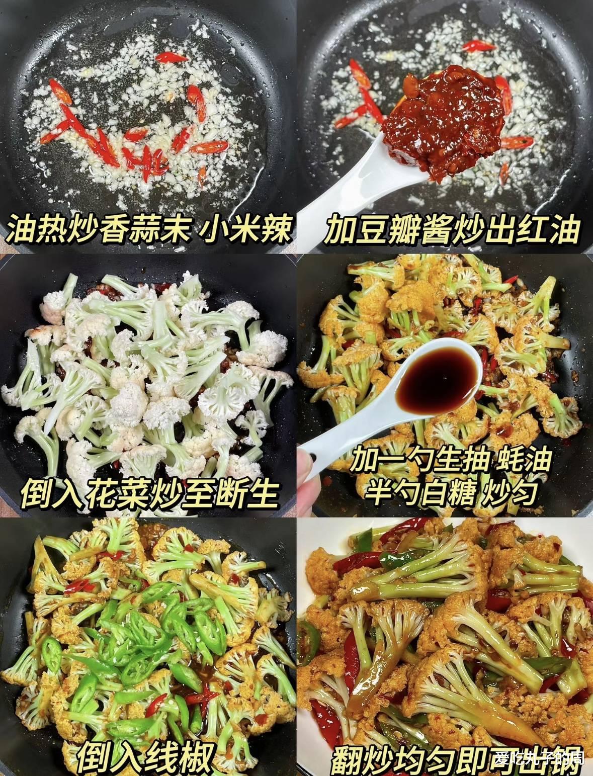材料准备:主料:菜花(花椰菜)1个辅料:干辣椒 适量(根据个人口味调整)花椒 1小把姜片 3片大蒜 5瓣(整颗或切片)青蒜苗或葱段 适量生抽 1汤匙老抽 半汤匙(用于上色)盐 适量糖 少许白胡椒粉 少许鸡精或鸡粉 少许(可选)食用油 适量蚝油 1汤匙(可选)步骤:1. 处理食材将菜花掰成小朵,放入淡盐水中浸泡约15分钟,然后捞出沥干水分。准备好所有调料,并将青蒜苗或葱切成段备用。