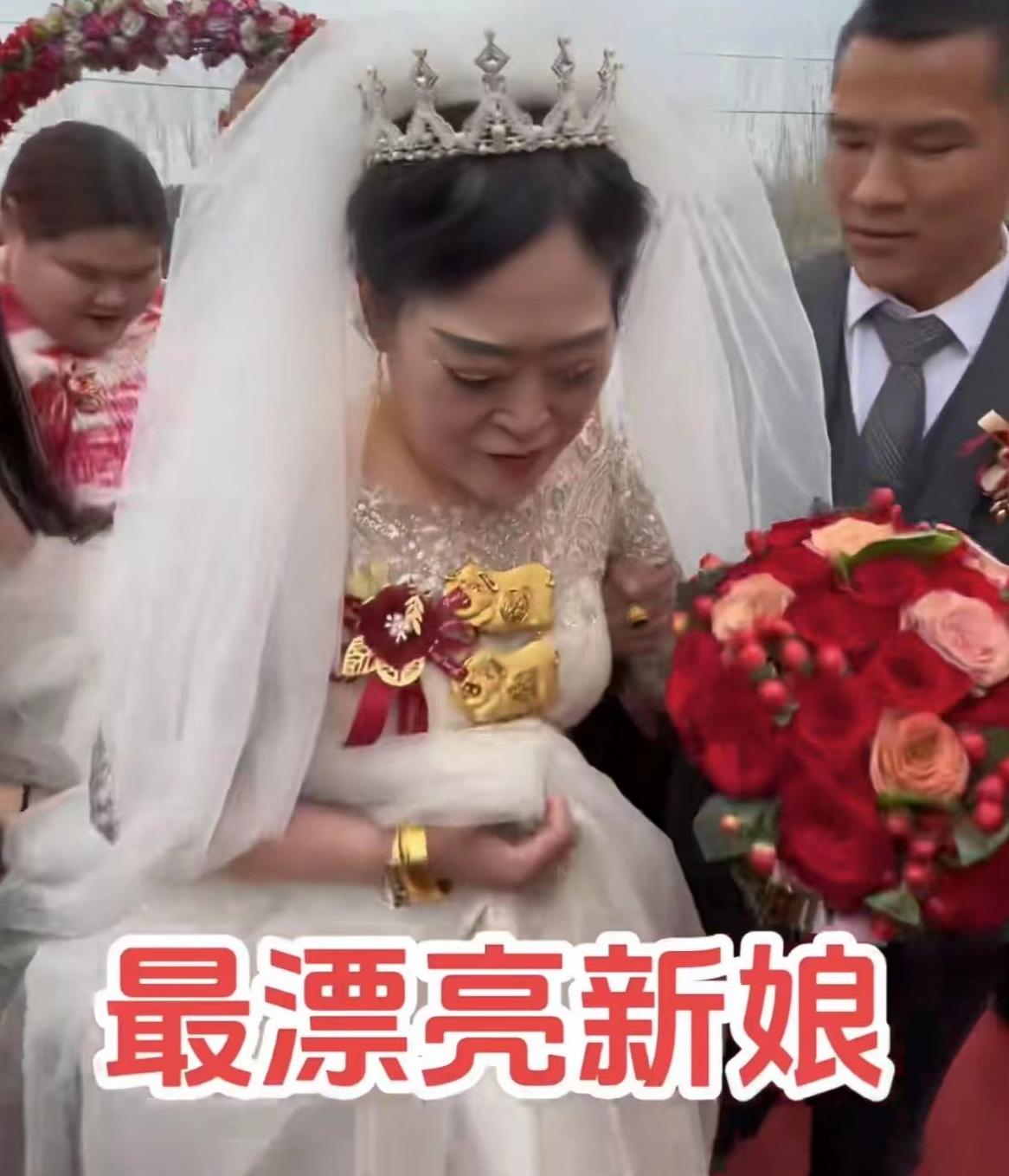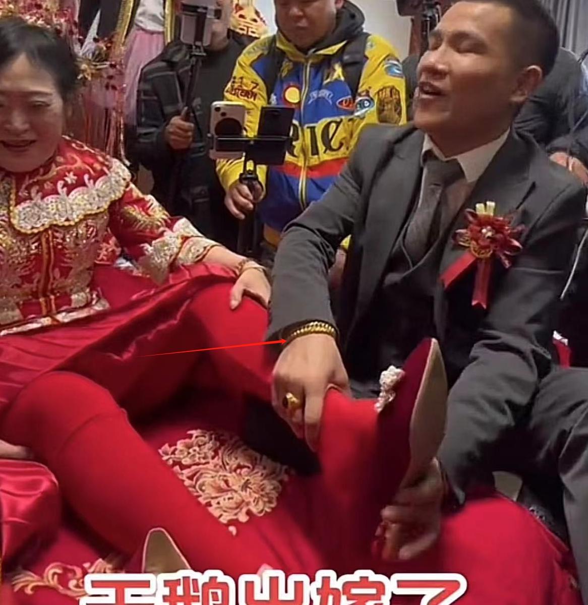 婚礼当天,天鹅姐穿着豪华的红色嫁衣,手腕上全是金镯子, 龙大美细心地为她穿上婚鞋。
