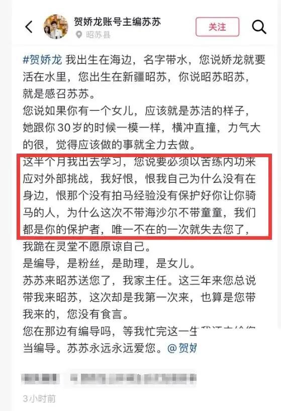 有意思的是,追悼会那天,贺娇龙的主编苏苏发了一条长文,讲了坠马的细节。她说自己外出学习半个月,没能陪在身边,很自责。坠马那天,是拍摄现场的临时人员经验不足,没保护好贺娇龙。这种“细节”很多网友都看懂了——拼事业的女人,身边的安全网往往没那么牢靠,关键时刻还得靠自己。苏苏的那句“我没保护好她”,多少也戳中了无数人的痛点。