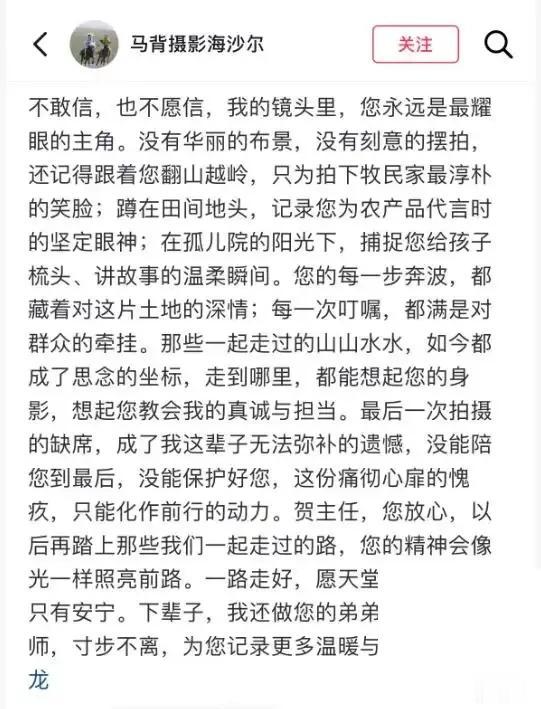 还有那个叫“小野马”的搭档,直播间里哭得上气不接下气。她说,贺主任一直是个“拼命三娘”,没日没夜地干活,谁劝都不听。这些年她身边的工作人员都知道,贺娇龙身上有种“要把事做成”的执拗。出事那天,她身边的熟人全都不在,摄影师海沙尔后来写了悼文,说这是他一辈子的遗憾。网友们说,除了家人,最懂她、最心疼她的,就是这些一起拼过的人。