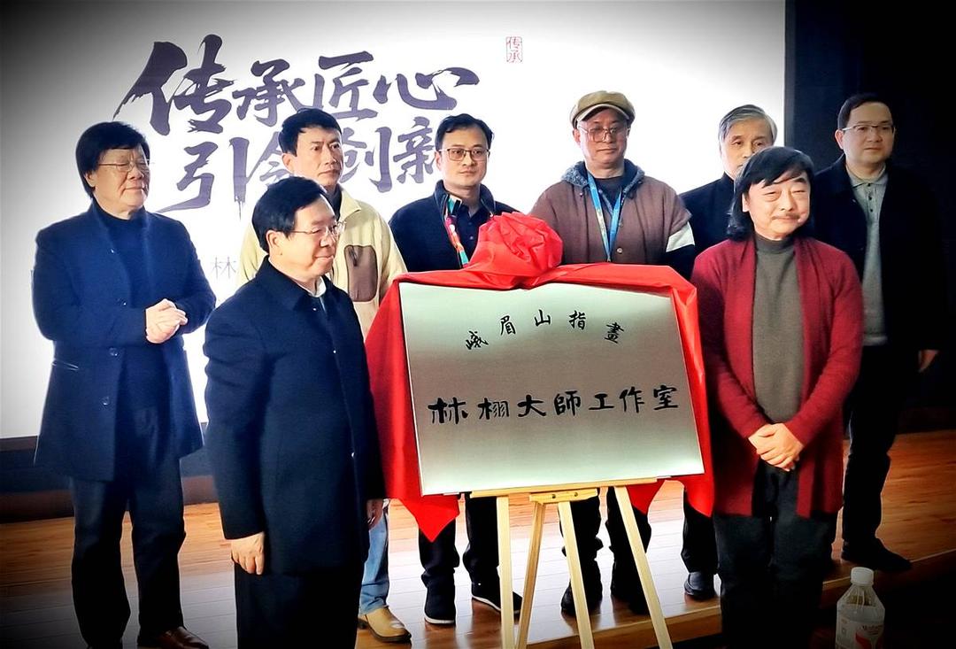 揭牌仪式后,与会嘉宾参观了“林栩大师工作室”。林栩与他的三位弟子林一雷、易树生、刘成明现场演示了指画技法。只见师徒四人配合默契,或用掌、或用指,短短十来分钟,一幅“峨眉山之巅”指墨山水图跃然纸上,气势磅礴,让嘉宾们感受到了非遗的无穷魅力。