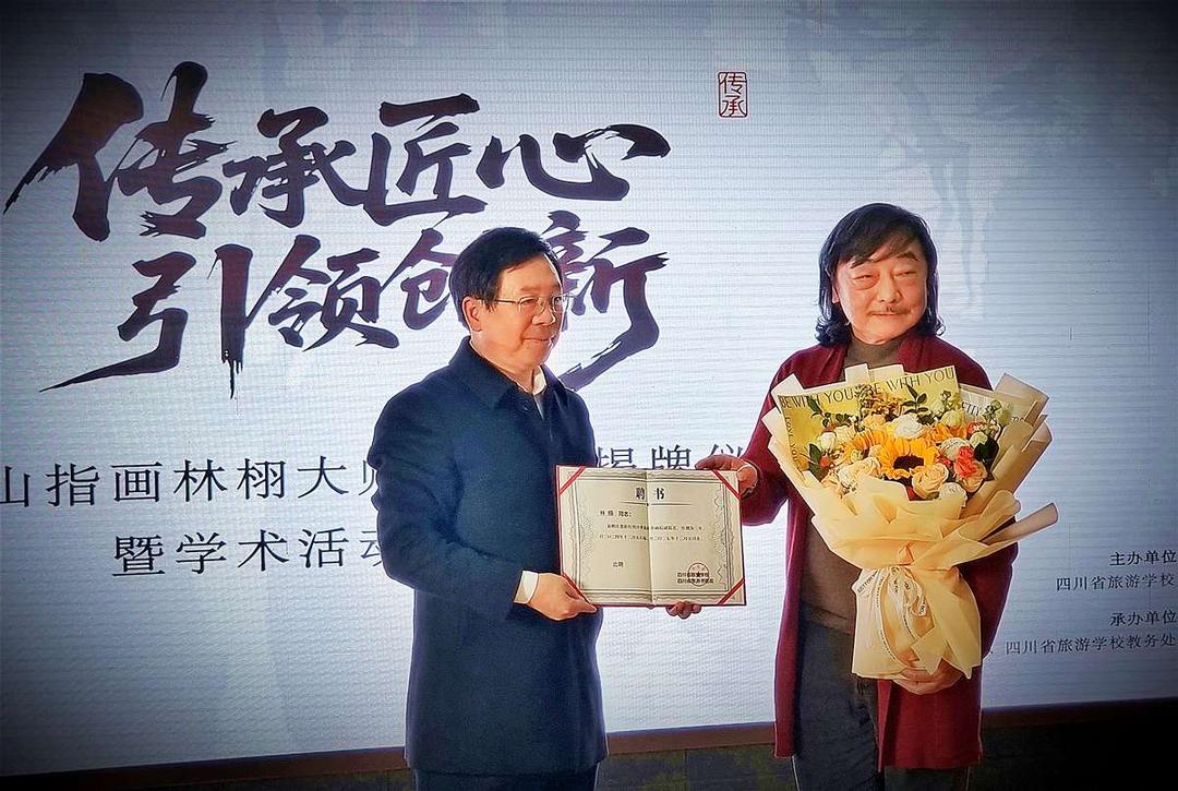 据共工新闻记者了解,揭牌仪式上,赵晓鸿还为林栩颁发了四川省旅游书画院副院长聘书,林栩为学校赠送了一幅他新创作的以“十二金鱼图”为内容,题款为“龙门翘楚”的指画作品,寓意四川省旅游学校培养的学生都是精英翘楚。并举行了拜师仪式。三位学生代表向林栩呈递了“拜师贴”,林栩回赠了“回师贴”。北京燕山画派创始人、中国山水画研究院院长陈克永,四川省文联副主席寒露,四川省民间文艺家协会副主席高小丁,乐山市美术家协会主席李开能等分别以微信或视频祝贺林栩大师工作室揭牌及研讨活动取得圆满成功。