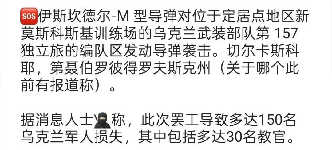 俄罗斯在战线以及后方的各种打击行动:过去24小时内,俄罗斯对敖德萨和乔尔诺莫尔斯克发动袭击。俄军呼叫一发“伊斯坎德尔-M”的空爆子母弹,成功摧毁乌军第157机械化旅的无人机营,这里的这些人也是即将被送往前线的FPV无人机操作员。乌方证实,俄军此次打击直接造成150名无人机操作员死亡。这是军事行动以来,乌军在无人机操作方面的最大损失。