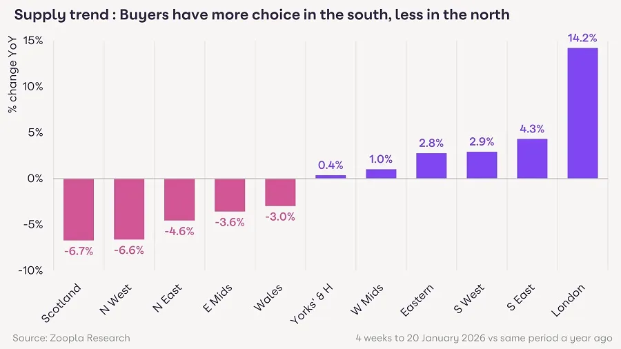 与之相反,伦敦、东南部和西南部等传统高房价地区则出现不同程度下跌,其中伦敦房价下跌0.7%,主要因这些地区房价基数较高,购房者对价格敏感度更强,部分需求向周边低价区域转移。