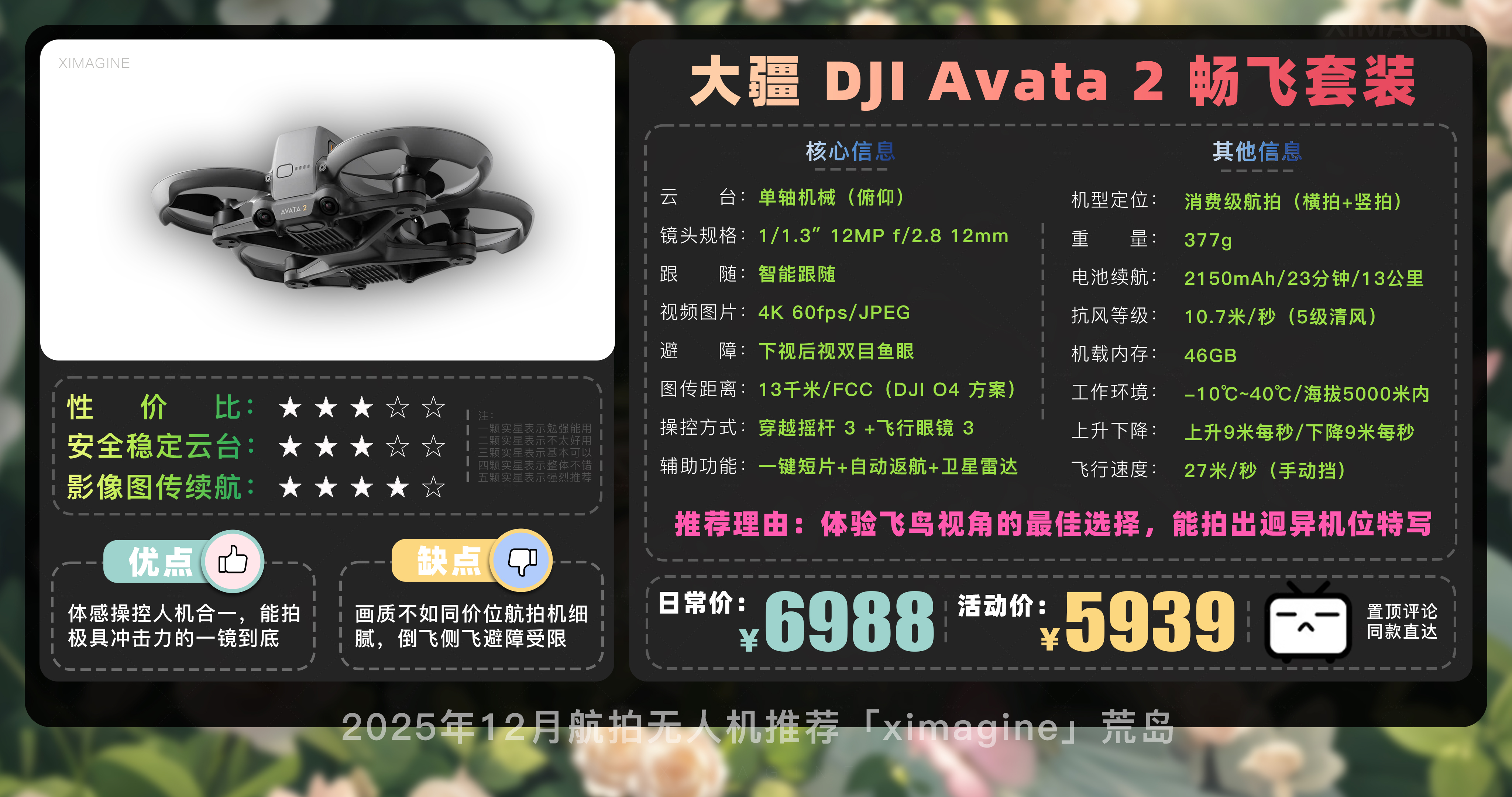 大疆 DJI Avata 2 畅飞套装这台机器根本不是用来拍照的,而是用来飞的,戴上飞行眼镜拿起穿越摇杆,那种人机合一的沉浸感让人上瘾,就像自己长了翅膀一样。自带的桨叶保护罩可以在狭窄的楼道、树林里钻来钻去,撞一下也不怕翻个身继续飞,它拍出来的画面配合那种高速的动态模糊,视觉冲击力极强。但是它的噪音真的挺大,在安静的小区飞容易挨骂,而且画质细腻程度不如同价位的航拍机,不适合拍那种静态的风光大片。如果想追求刺激,想拍第一人称视角的爽片,5939 元的拥有空中赛车的体验。