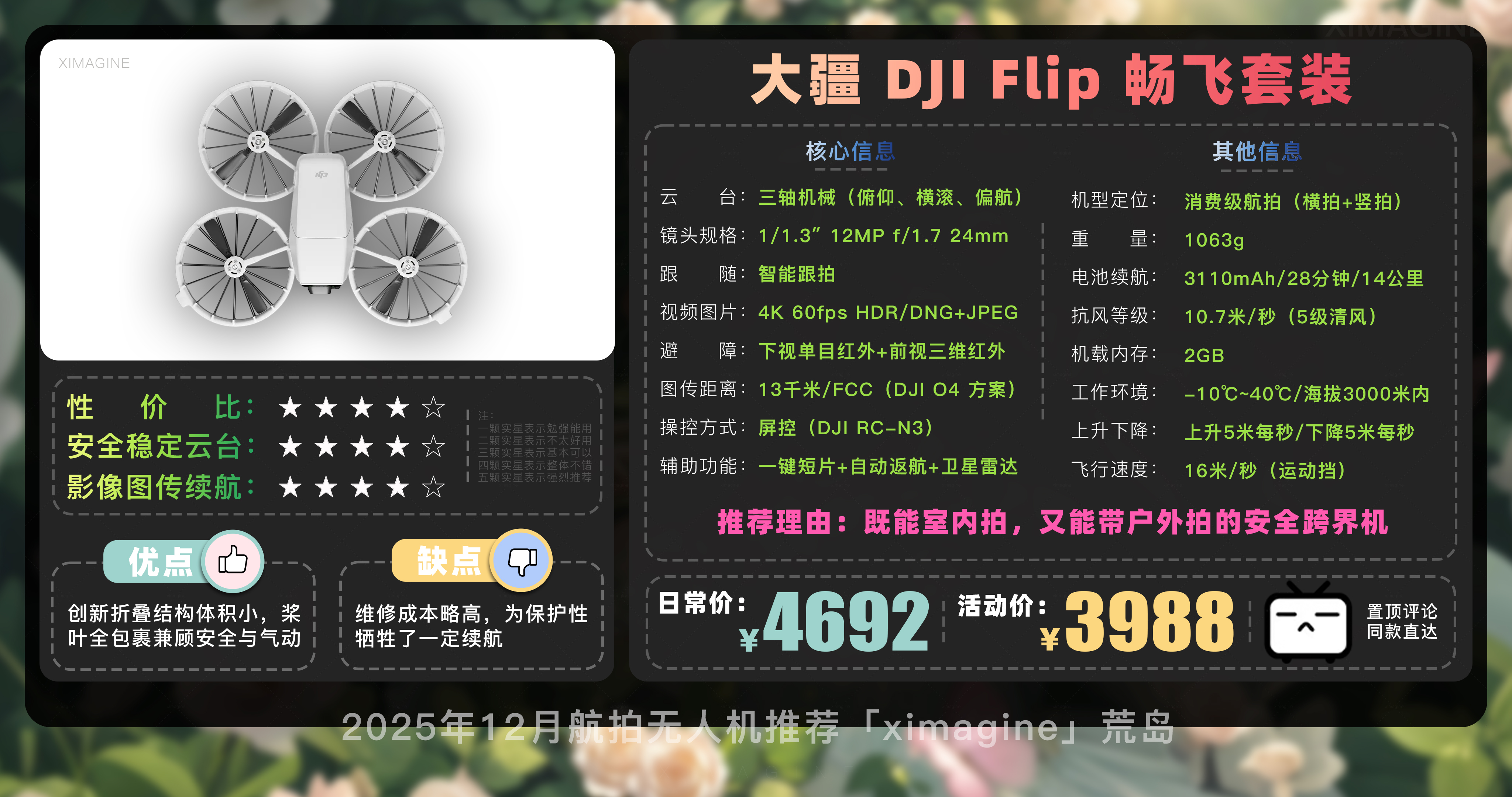 以上就是本期25年12月航拍无人机推荐清单,如果有心水的型号,可以戳置顶评论区对应链接拿下!最后想和大家分享的是,价格决定了画质的上限,但决定不了快乐的阈值。所以不要有设备焦虑,最好的无人机,是那台愿意把它带出门飞上天,而不是放在柜子里吃灰的机器。如果你是第一次接触航拍,希望这期视频能帮你省下试错的钱; 如果你已经是老飞手,也欢迎在评论区聊聊你现在的主力机给大家做个参考。本期就到这,如果觉得内容有所帮助,请三连支持!我是「ximagine」,下期再会!