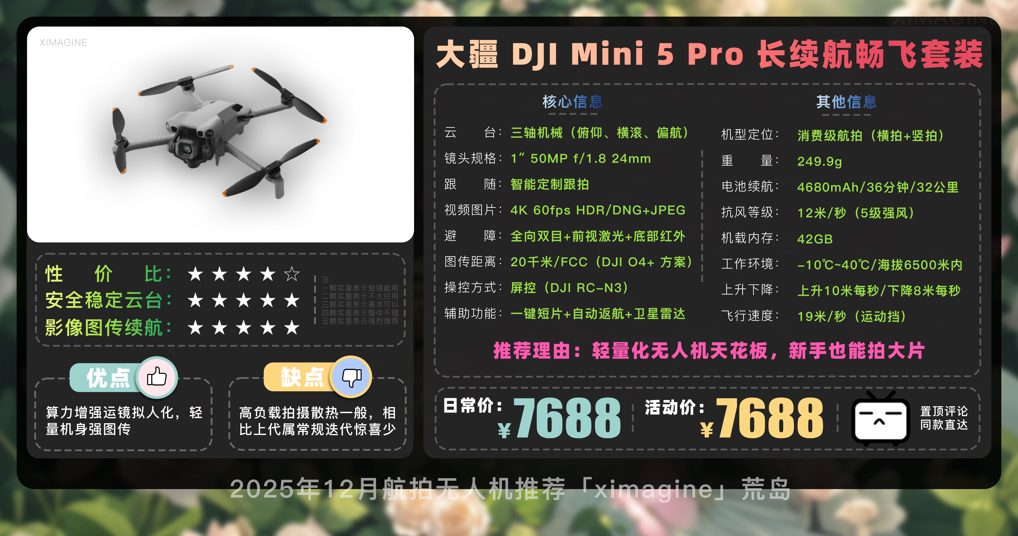 欢迎来到2025年12月航拍无人机推荐合集!我是「ximagine」每个人想飞的原因都不一样,有人是为了圆儿时的飞行梦,有人是为了旅行发个朋友圈,还有人是想靠它拍大片。但残酷的现实是,很多人买无人机之前根本没想好要拿它干什么,结果要么买了个几千块的高端货在柜子里吃灰,要么买了个几百块的工业垃圾飞一次就退坑。为了帮大家理清思路,分享我总结的三个选购逻辑。关于稳定性,如果你想出片机械云台是物理防抖的基础,电子防抖都是通过裁切画面实现,画质损失很大。关于图传,空旷的野外飞 5 公里和在有干扰的城市里飞 500 米,对图传的要求是完全不同的,信号的抗干扰能力才决定了敢不敢飞,毕竟提控回家是所有飞手的噩梦。关于便携与抗风的矛盾,249g 小飞机好带还不用申报,但在海边或山顶,它的抗风能力就是物理硬伤,大飞机稳画质好,但每次出门背着它都是个负担,需要在这两者之间做一个取舍。基于以上逻辑,我按照价格和对应的用途将 18 款无人机分成三组,1000 元以内适合想低成本体验飞行乐趣, 1000 到 5000 元适合旅行记录和家庭拍摄,5000 元以上适合有商业拍摄对高画质有要求,没有完美的机器,只有适合自己的,话不多说,正餐开始!