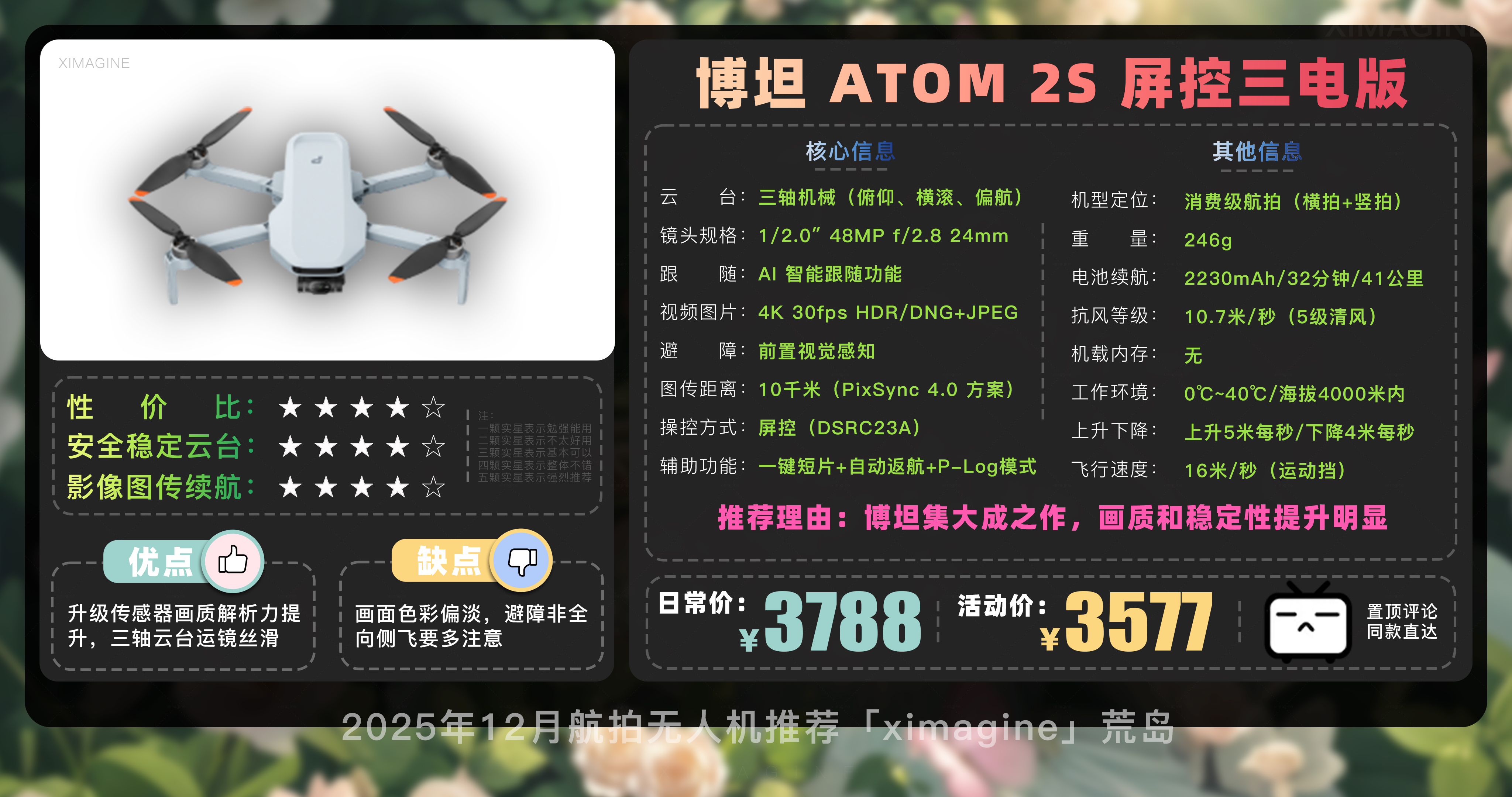 博坦 ATOM 2S 屏控三电版这台机器让我看到了国货的巨大进步,这次升级传感器后画质非常能打,白天的解析力很棒,色彩虽然偏淡但很真实看着舒服。三轴云台让它的视频画面非常丝滑,配合它家一贯优秀的飞控,在城市里穿梭拍摄非常有信心,图传在干扰严重的市区表现也比上一代好很多。避障系统还不是那种全向无死角的,侧飞的时候得盯着点,智能跟随虽然有,但跟那种快速移动的车还是有点吃力。总体来说 3577 元的它在画质和体验上已经非常接近第一梯队的水平了,是那种买了不会后悔的实用派。