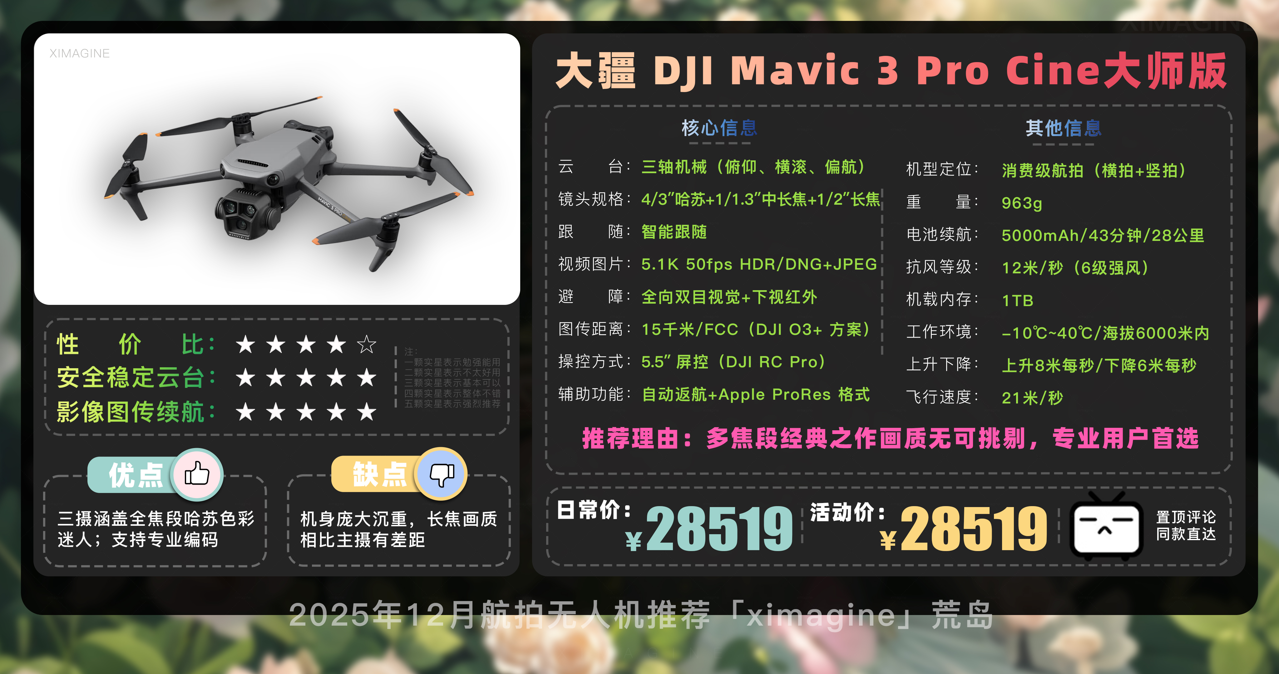 大疆 DJI Mavic 3 Pro Cine 大师版当把这台机器拿在手里,沉甸甸的分量就在告诉你这是专业的,三颗摄像头涵盖了广角到长焦的所有焦段,尤其是那颗哈苏主摄,直出的色彩真的太迷人了,有一种油润的高级感,拍完几乎不用调色就能用,它的后期宽容度极高,在大光比环境下能救回很多细节。但是它真的很大很重,每次带它出门都需要下很大的决心,爬山徒步是个负担,而且那颗七倍长焦的画质相比主摄还是有一定差距。如果你是接单干活,或者对画质有极致苛求的摄影师,28519 元的它是专业生产力工具绕不开。
