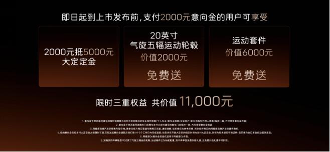 阿维塔06现已开启预售,即日起到上市发布前,支付2000元意向金的用户可享受限时三重权益,包括2000元抵5000元大定定金;免费赠送价值2000元的20英寸气旋五辐运动轮毂;免费赠送价值6000元的运动套件,三重权益共价值11000元。