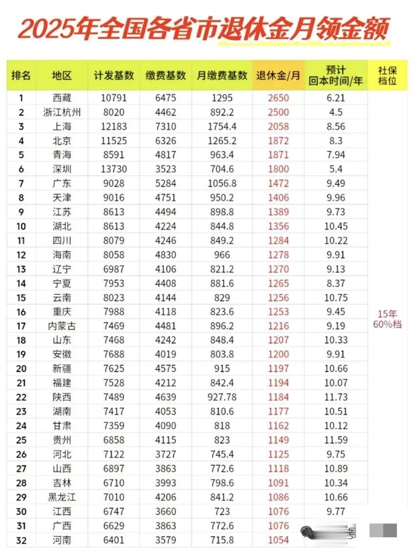 据不完全统计,2025年各省市职工基础退休金排名表如下,仅供参考。
