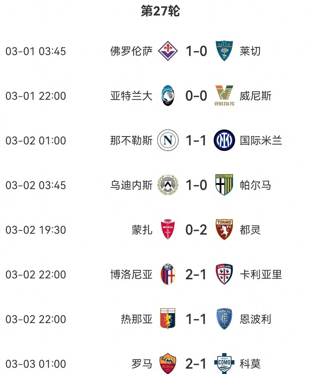 截止北京时间3月4日凌晨,意甲联赛第27轮的比赛已经全部结束。其中几场焦点比赛,尤文图斯2-0完胜维罗纳、罗马2-1逆转战胜科莫、亚特兰大0-0威尼斯、拉齐奥2-1绝杀AC米兰,上演狂欢足坛盛宴,接下来看看意甲第27轮积分榜的最新排名情况。