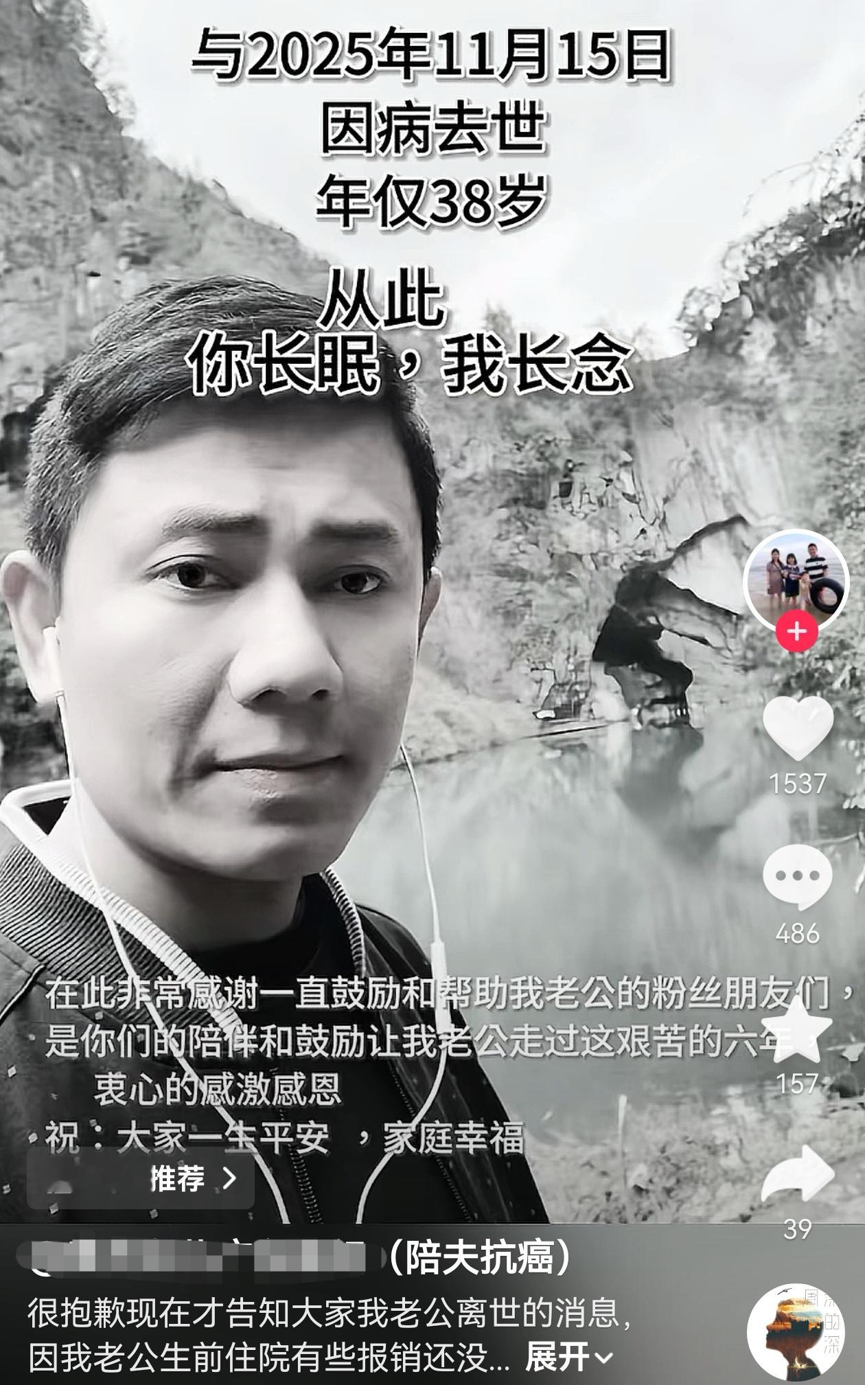 1月7日,成文东的妻子带着歉意发布讣告,称丈夫已于2025年11月15日去世,年仅38岁,感谢粉丝一直以来的帮助、鼓励和陪伴,此前是因为很多后事没有办完,所以现在才告诉大家。