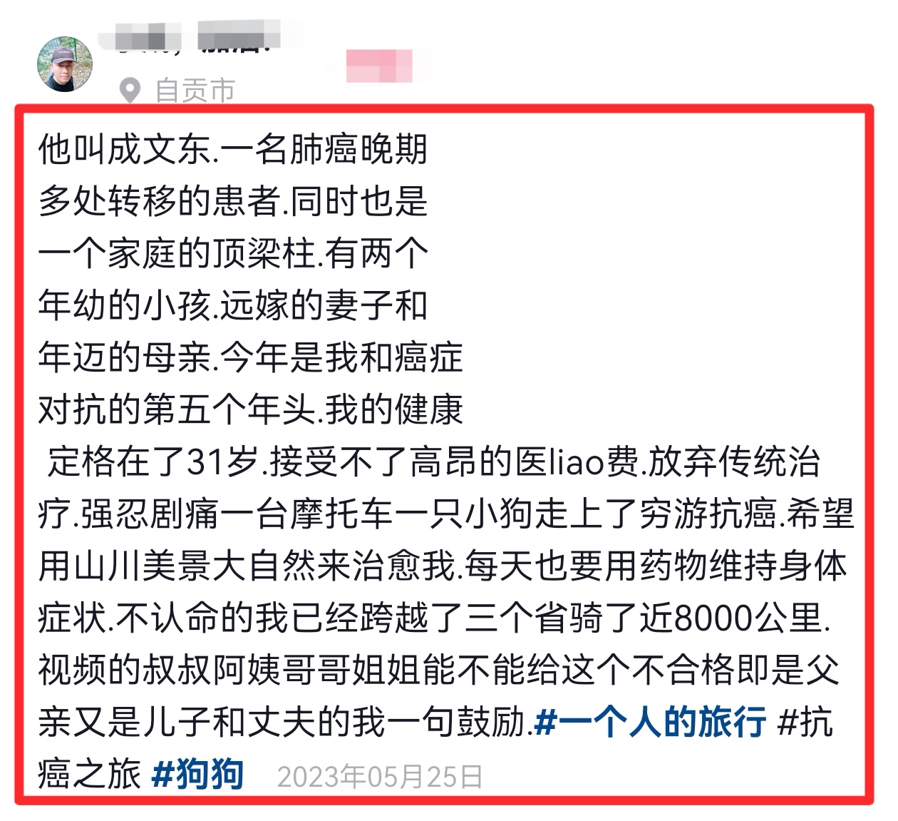 在后来的总结中,成文东终于承认是因为经济不具备,放弃了传统治疗,忍着剧痛骑着摩托车,带着一只小狗骑行穷游,相拥山川美景来治愈自己,前后骑行跨越三个省,距离超过8000公里。
