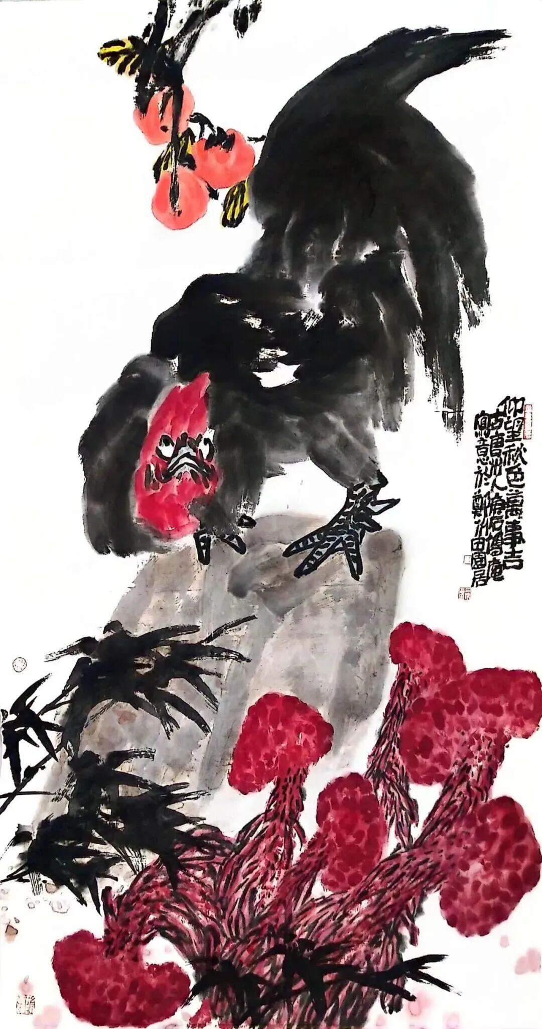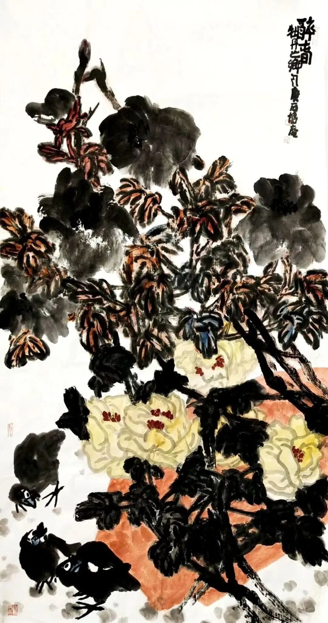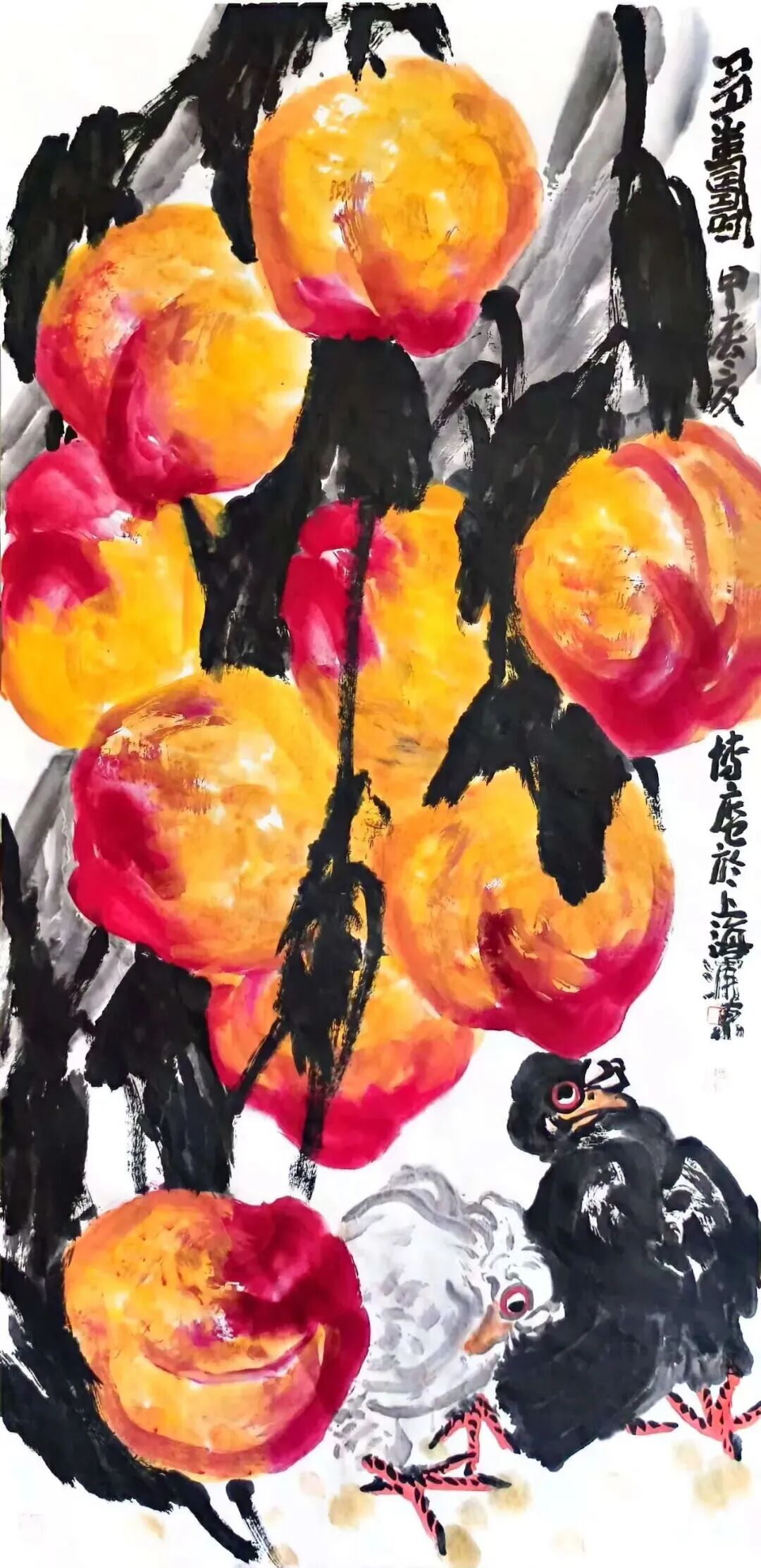 二、 内核与路径: “舍表求本”的心性修炼田博庵的艺术追求,可视为一场持续的心性修炼。其核心方法论,在于 “舍”。1. 舍外在之浮名小利:这使他避开了为市场而创作、为声誉而变形的陷阱,获得了艺术方向的自主权。2. 舍程式之陈规旧法:他深入传统大写意堂奥,汲取吴昌硕、齐白石等人的精神养分,但绝非泥古不化。其构图常突破传统折枝范式,趋于饱满、宏大甚至抽象构成;用笔用色更加率真强烈,情感喷薄而出。这是“舍”其形迹,“得”其精神。