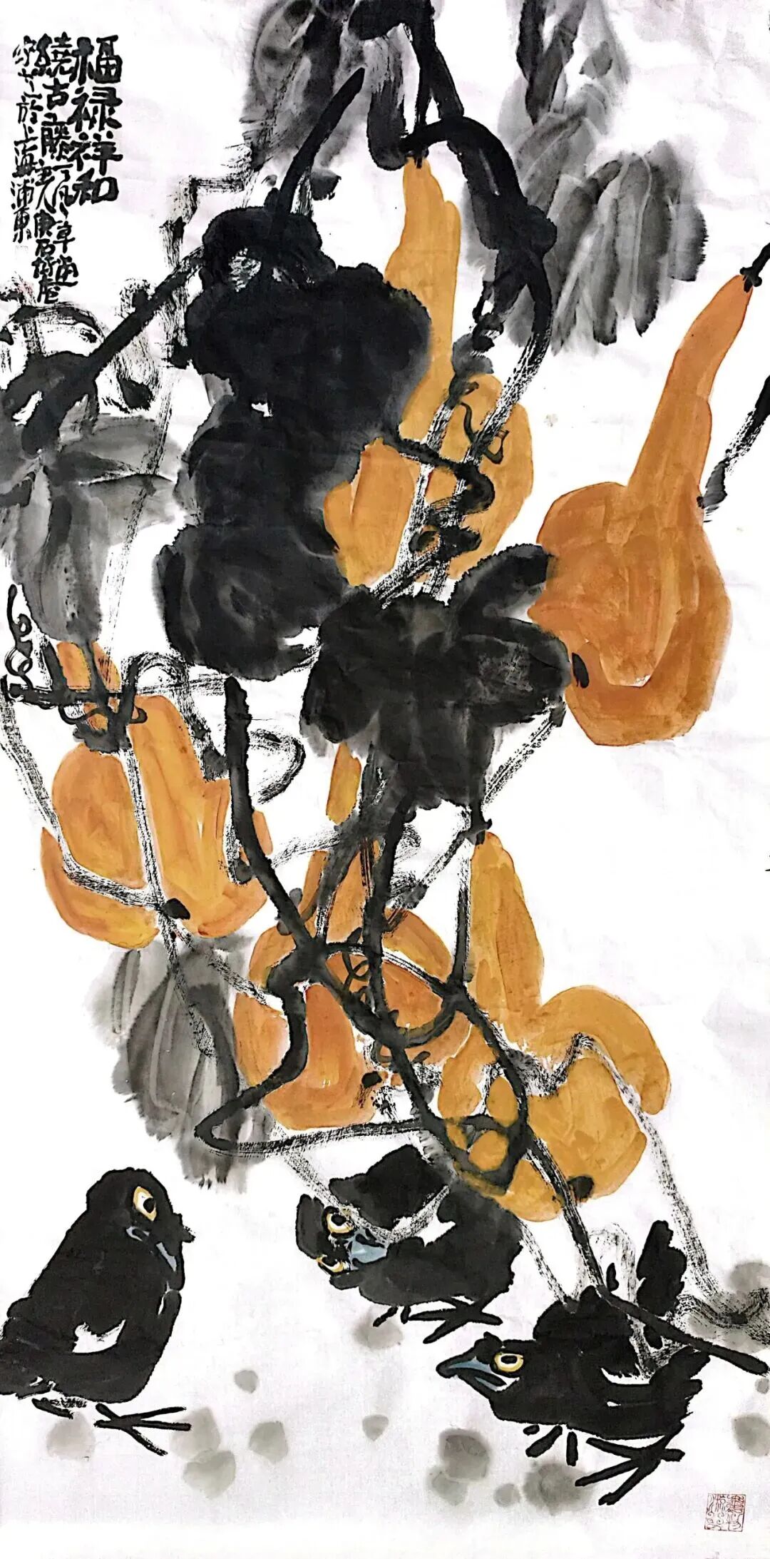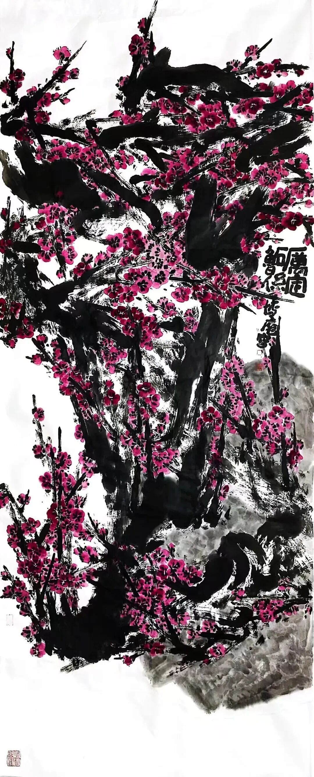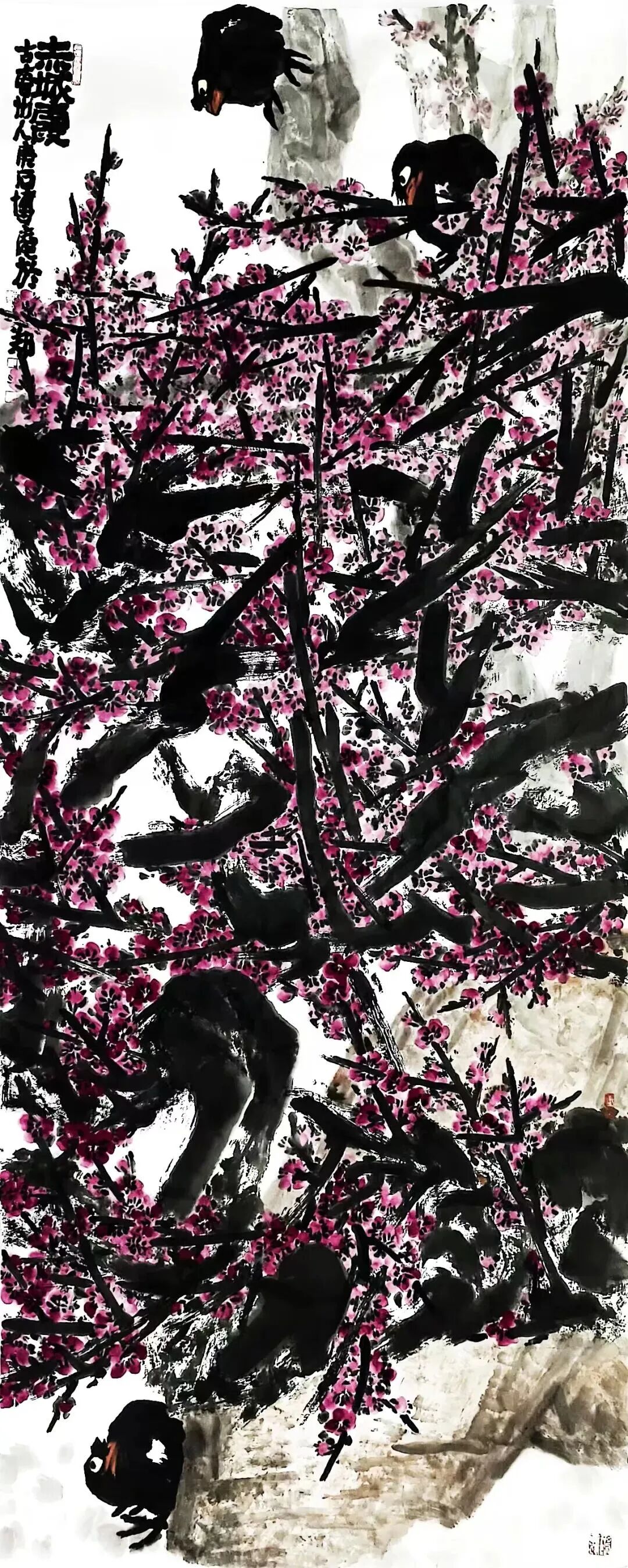 二、 内核与路径: “舍表求本”的心性修炼田博庵的艺术追求,可视为一场持续的心性修炼。其核心方法论,在于 “舍”。1. 舍外在之浮名小利:这使他避开了为市场而创作、为声誉而变形的陷阱,获得了艺术方向的自主权。2. 舍程式之陈规旧法:他深入传统大写意堂奥,汲取吴昌硕、齐白石等人的精神养分,但绝非泥古不化。其构图常突破传统折枝范式,趋于饱满、宏大甚至抽象构成;用笔用色更加率真强烈,情感喷薄而出。这是“舍”其形迹,“得”其精神。