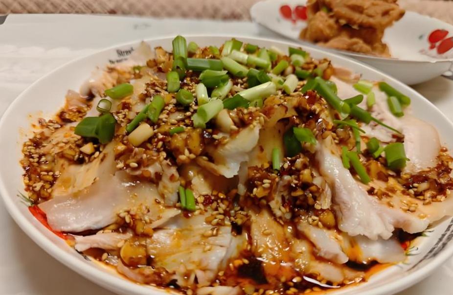 煮熟后的五花肉冷却再切片,搭配由蒜泥、生抽和辣椒油调制的酱汁,香味扑鼻,让人忍不住想来一块。