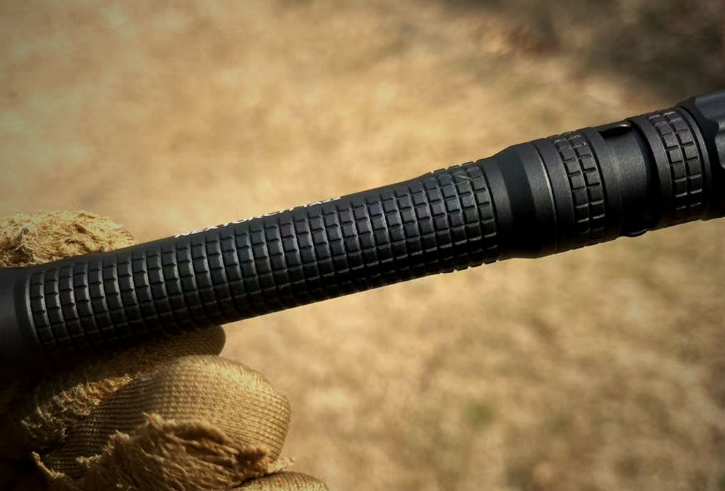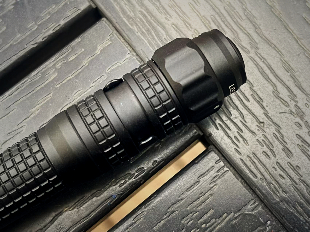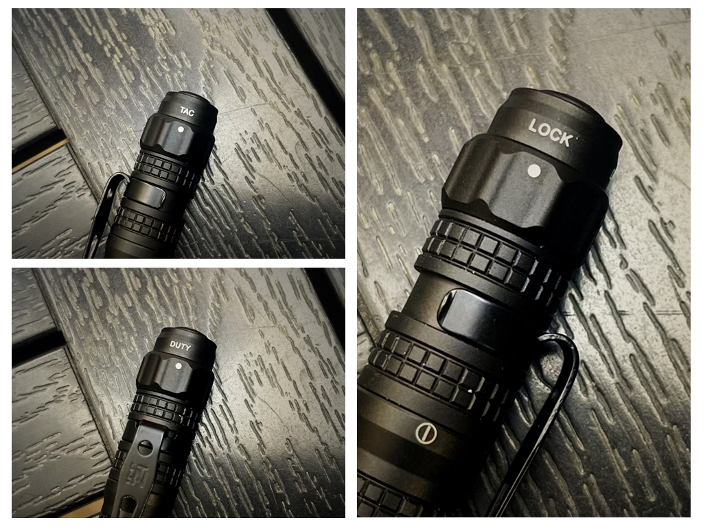 筒身尾部,开关下方设有多模式调节环,分别为锁定断电模式、勤务模式和战术模式。